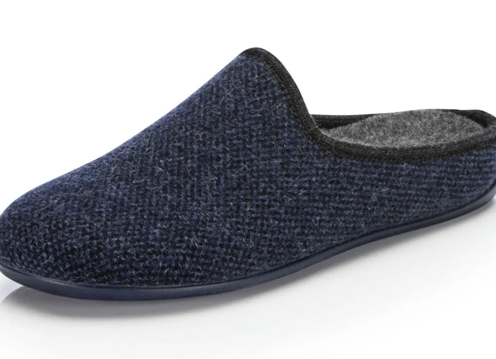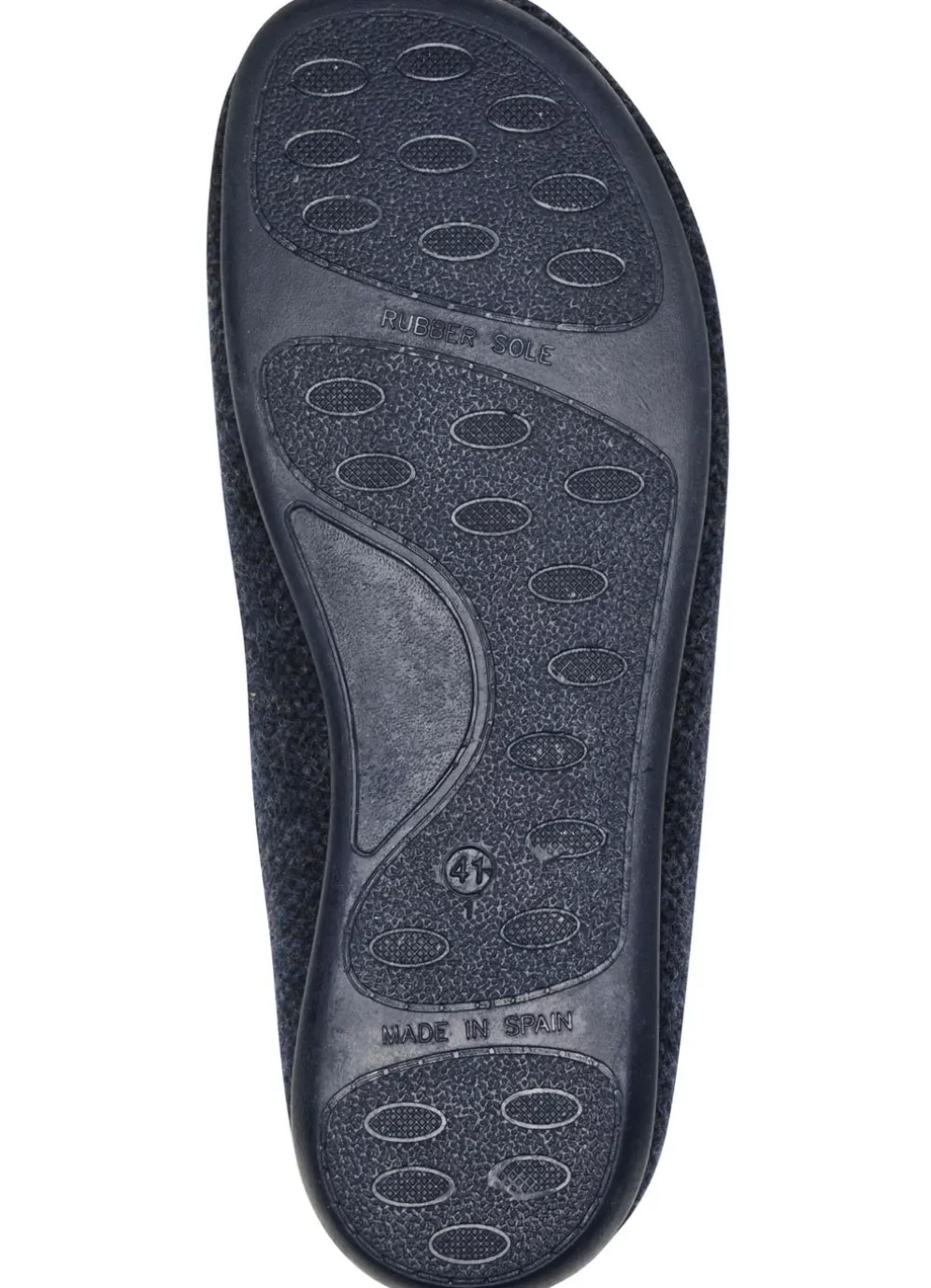 Pantoffel aus dezent gemustertem Textilmaterial in Marine und in Größe 46.