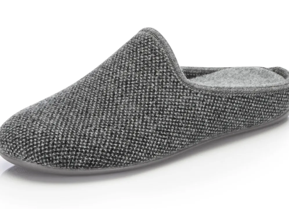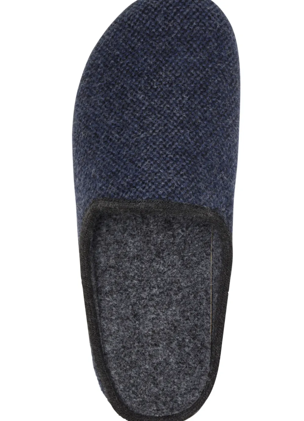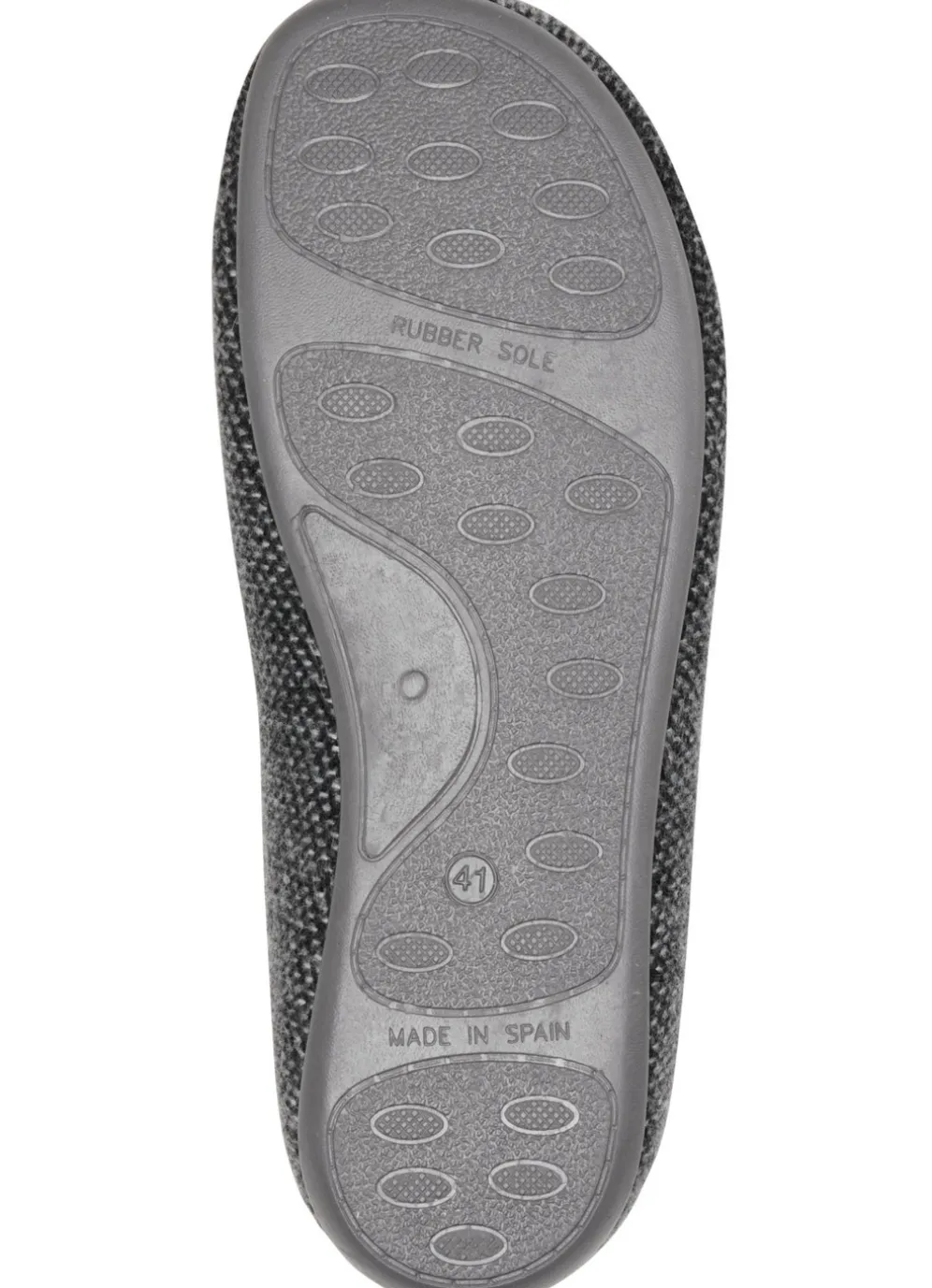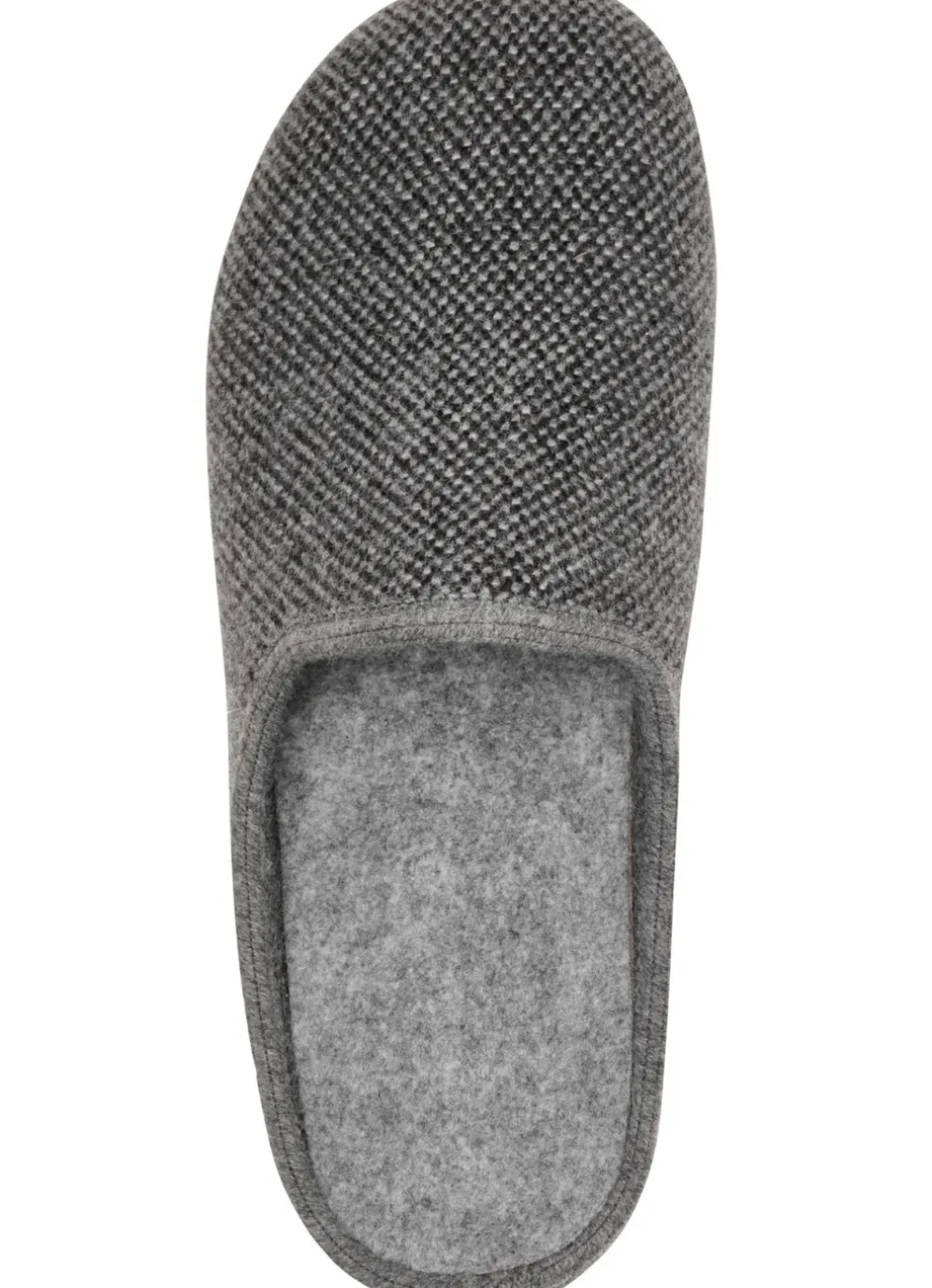 Pantoffel aus dezent gemustertem Textilmaterial: Weite G, gepolstertes Futter und herausnehmbares Filz-Fußbett aus recyceltem Polyester sowie superleichte Gummi-Laufsohle