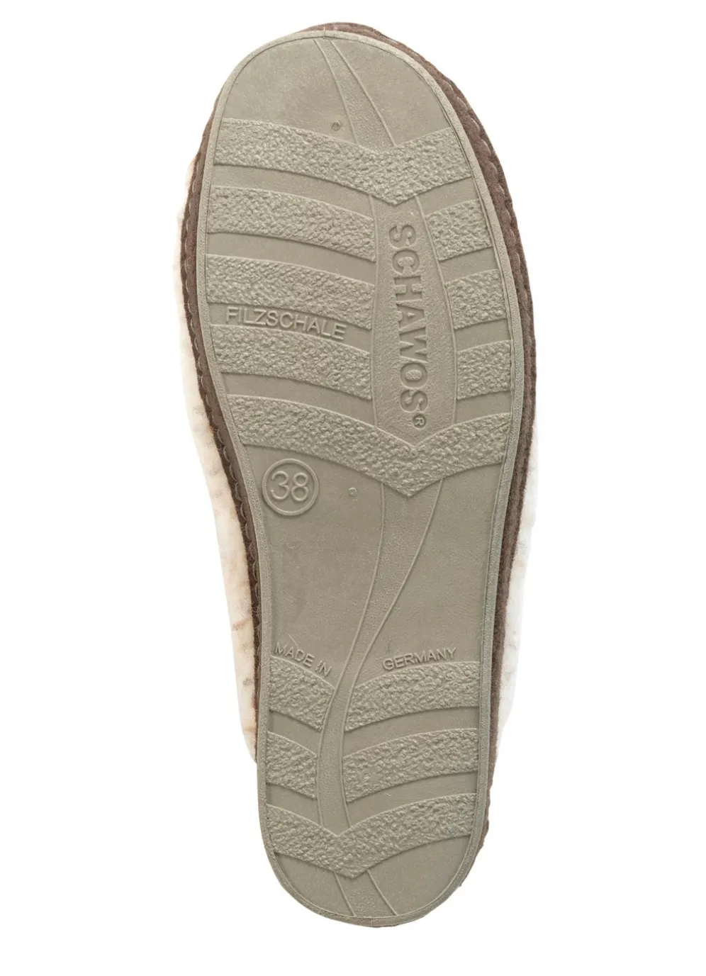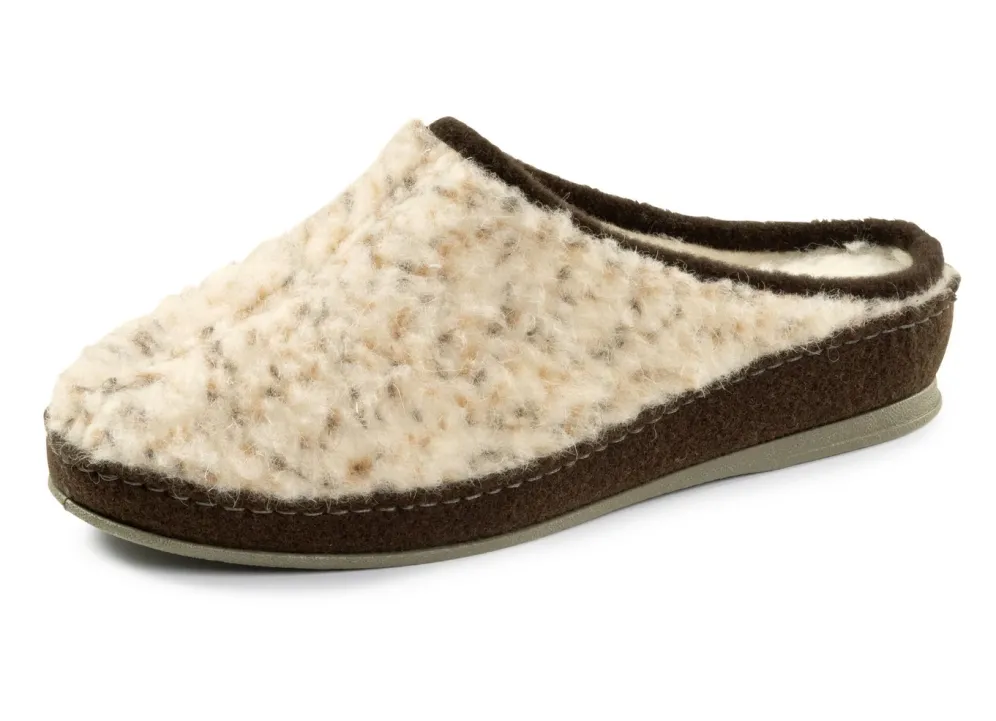 Gemütlicher Pantoffel aus gesprenkeltem Wollplüsch in Beige-Braun: Warmfutter und Fußbettbezug aus 100% Schurwolle, Fersenluftpolster, Filzschalensohle, TR-Laufsohle sowie 25 mm Keilabsatz