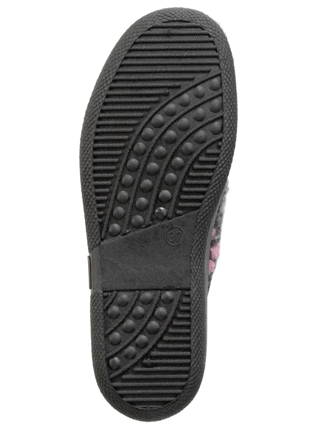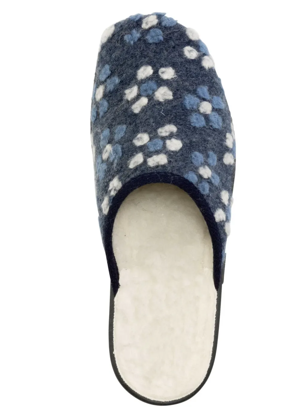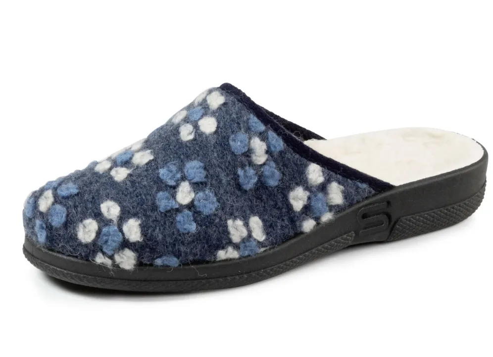 Pantoffel aus weichem Filzmaterial mit Blüten-Dessin: Weite H, Warmfutter und Fußbettbezug aus reiner Schurwolle, leichte PVC-Riffelsohle, 15 mm Keilabsatz