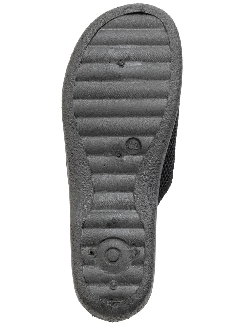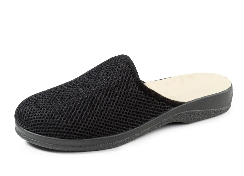 Schwarzer Pantoffel aus gepolstertem Textilmaterial: Warmfutter und Decksohle aus 100% Schurwolle, leichte PVC-Laufsohle