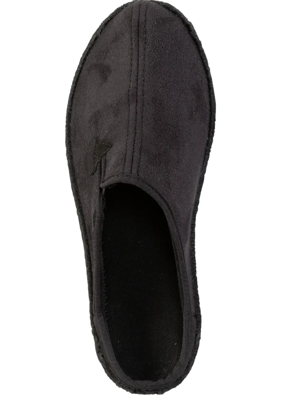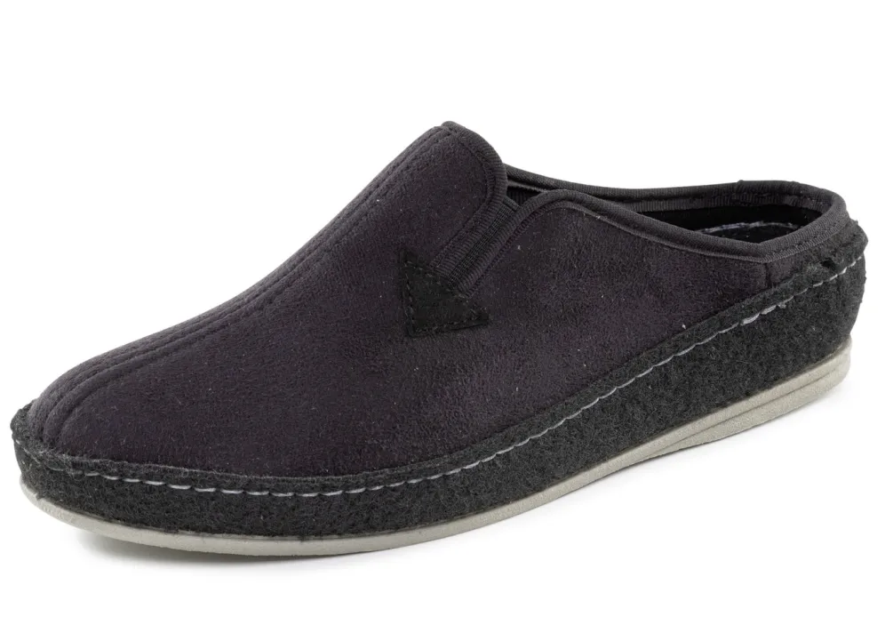 Schwarzer Velours-Pantoffel mit seitlich eingesetztem Gummizug: Futter und Decksohle aus Textil, Filzschalensohle sowie TR-Laufsohle