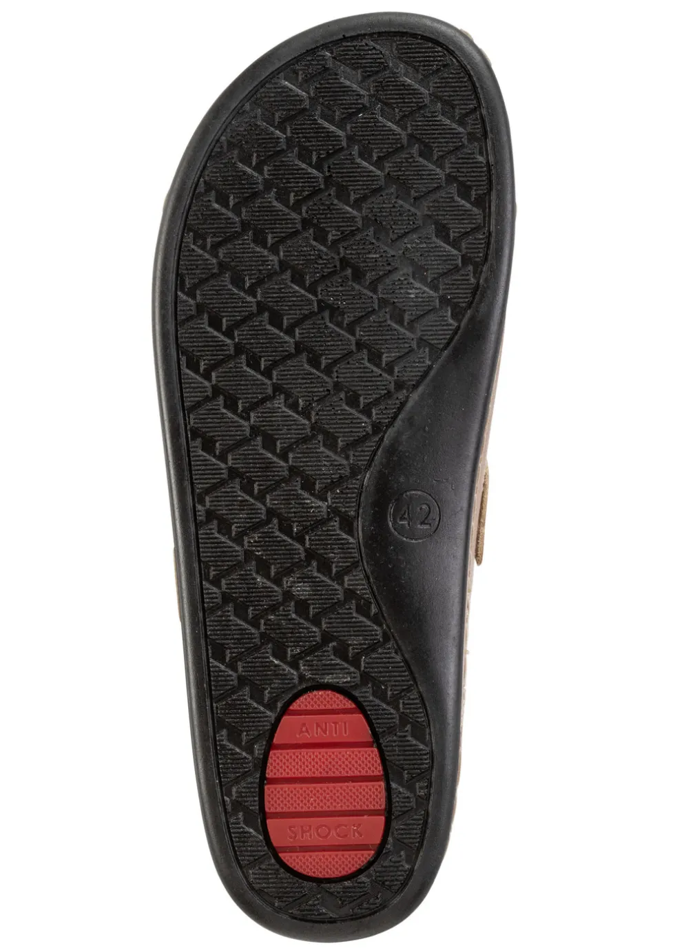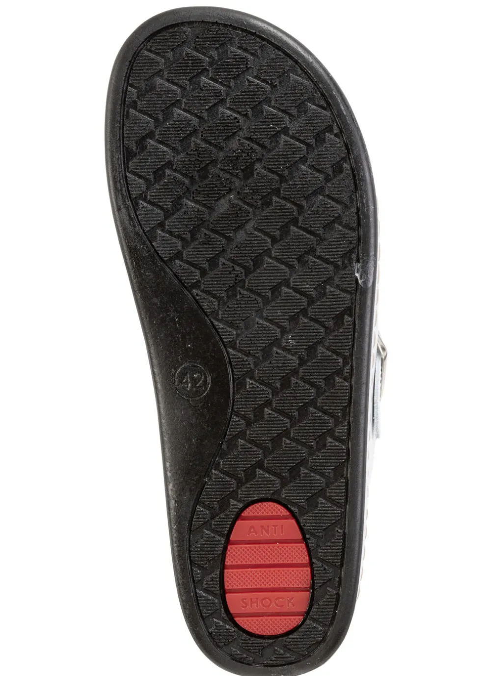 Pantolette aus Nappaleder mit luftiger Perforation: verstellbare Schließe, gepolstertes Lederfußbett, leichte PU-Laufsohle
