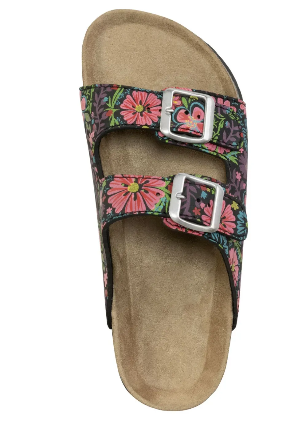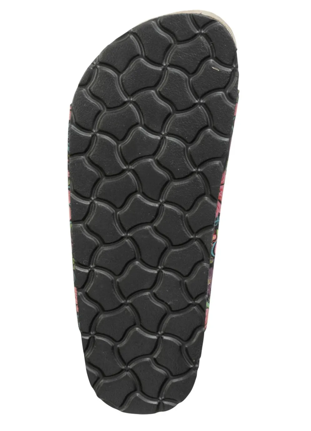 Pantolette aus verspielt bedrucktem Synthetik, mit verstellbaren Spangen: gepolstertes Lederfußbett, leichte EVA-Profilsohle sowie 10 mm Keilabsatz