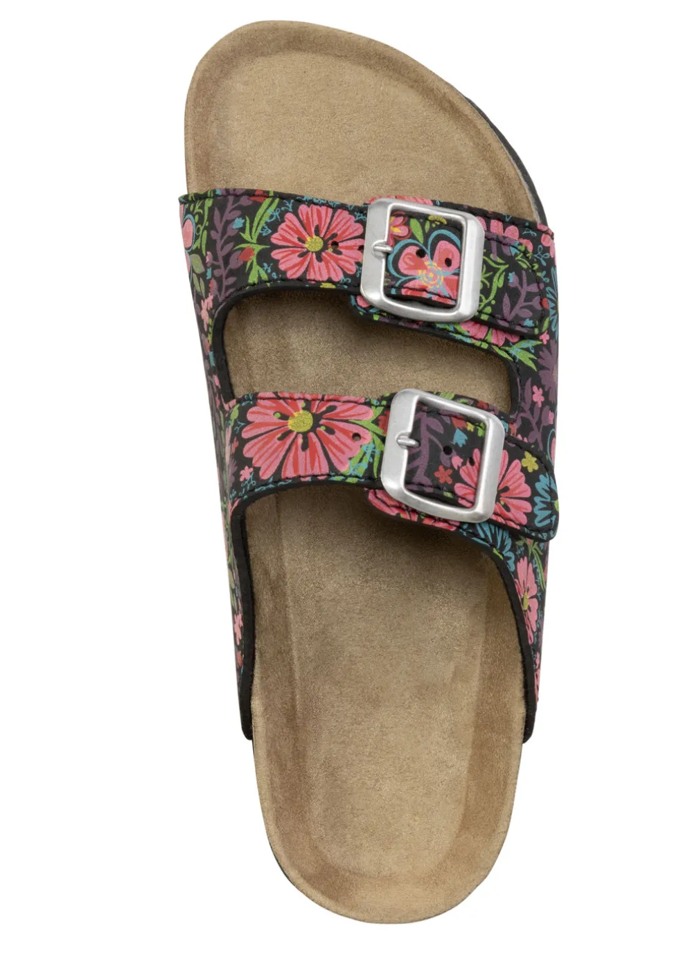 Pantolette in verspielt bedrucktem Dessin in Schwarz-Bunt und in Größe 37.