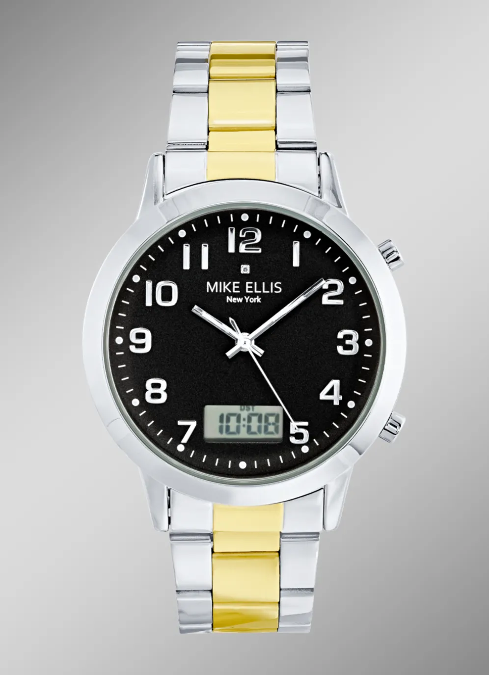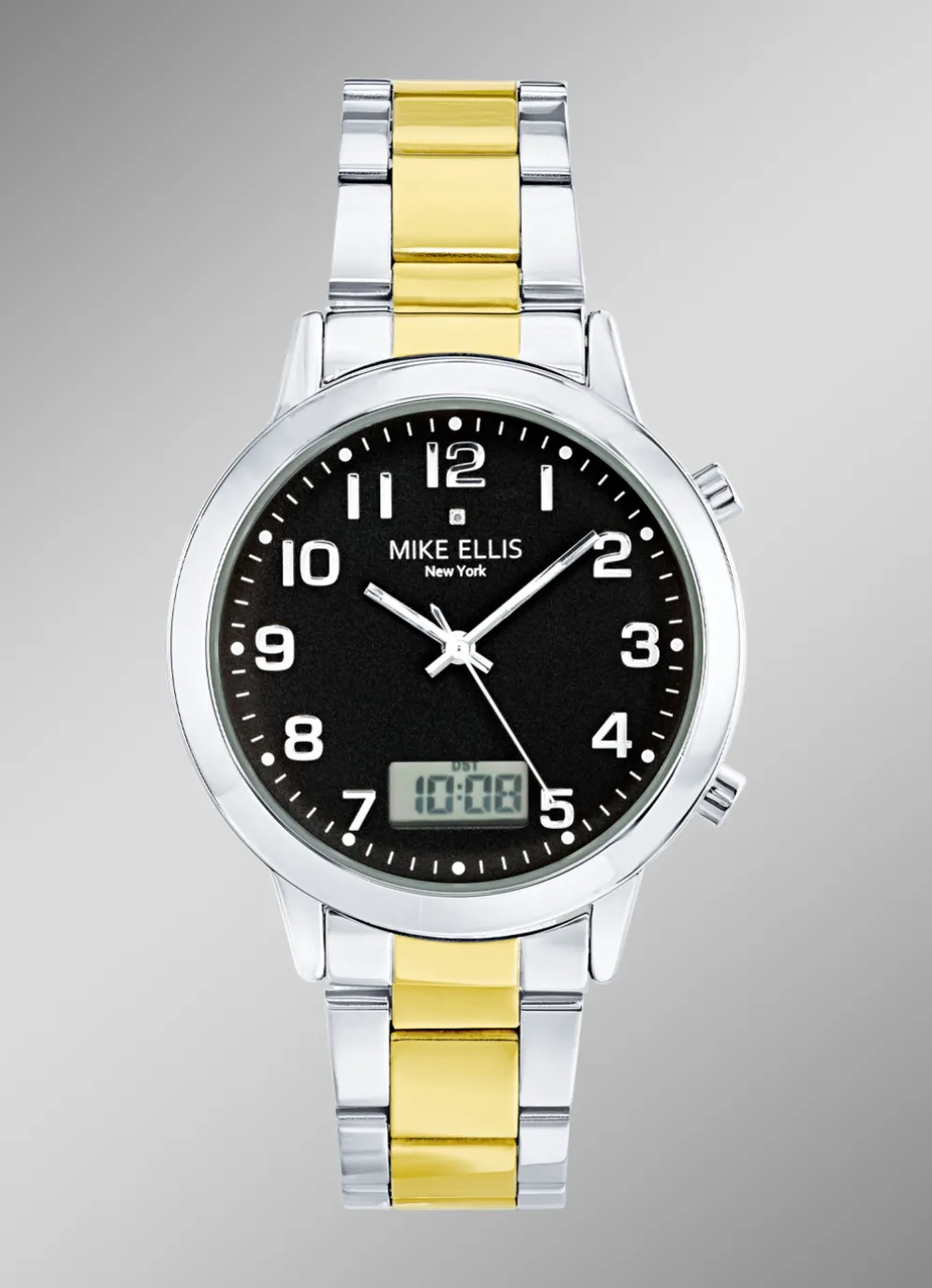 Extravagante Partnerfunkuhren der angesagten Marke Mike Ellis New York. Diese Uhren glänzen mit einem Edelstahlgehäuse. Die stilvolle Ergänzung sind das schwarze Zifferblatt mit goldfarbenem Index und das Edelstahlband in Bicolor mit Faltschließe.