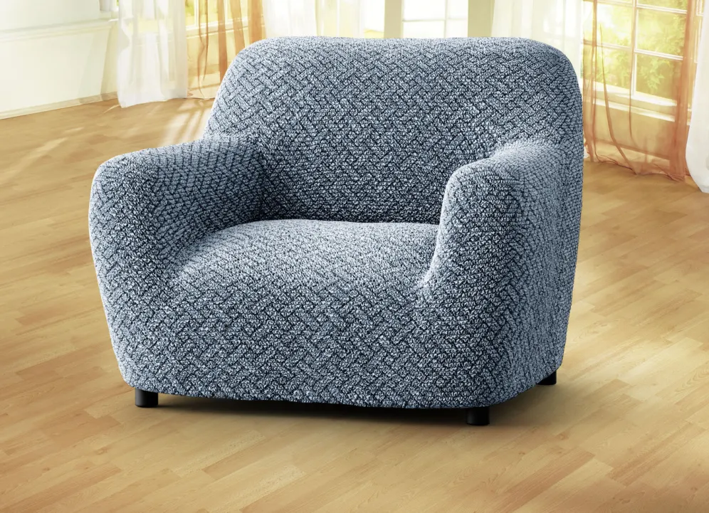 Passgenaue Stretchbezüge in Mikrofaser-Qualität in Größe 101 (Sesselbezug) und in Blau.