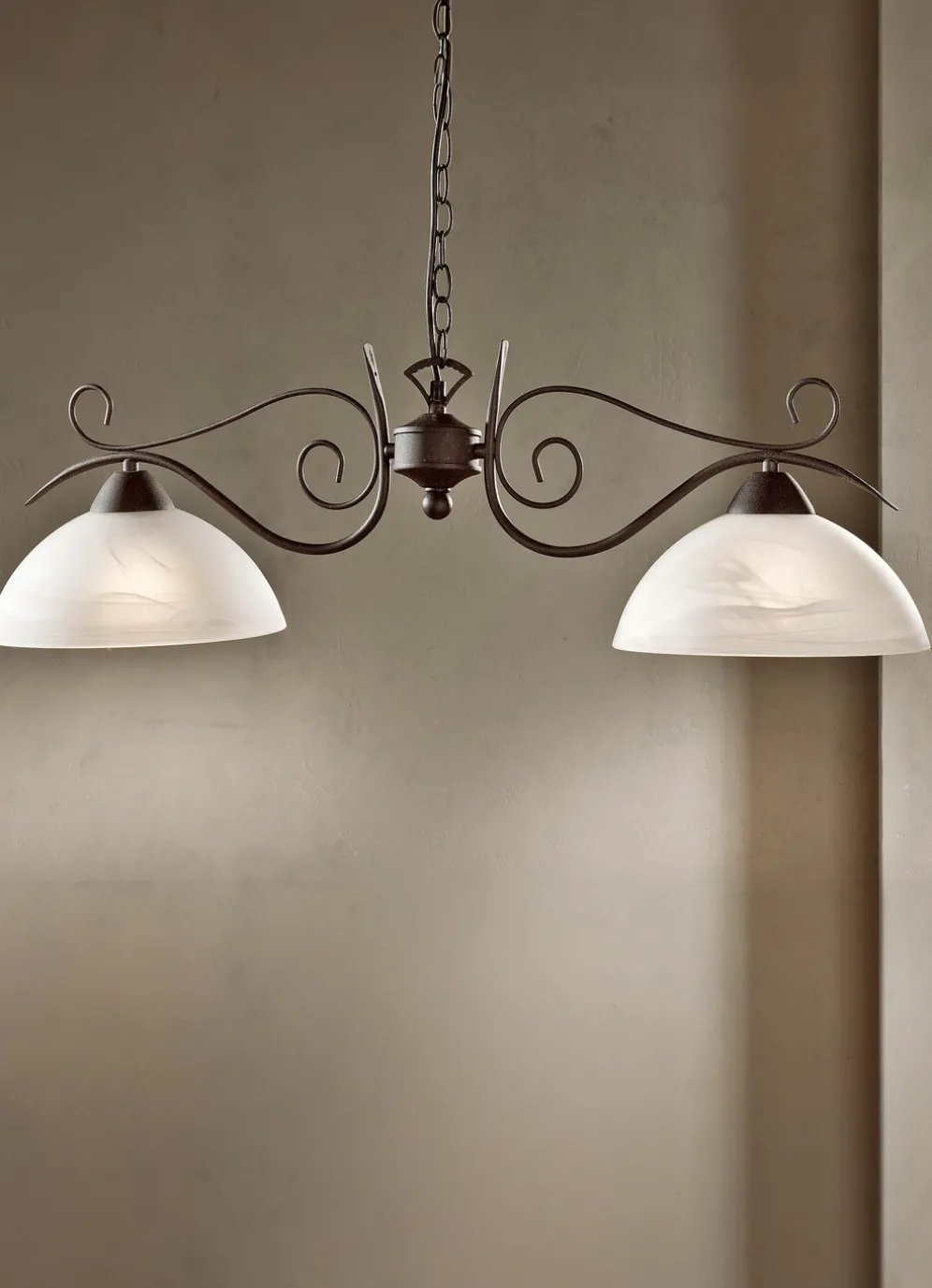 Exklusive Pendelleuchte mit geschwungenem Gestell aus antik rostfarbenem Metall sowie Schirm aus weißem Alabaster-Glas. Lieferung ohne Leuchtmittel. Mit Aufbau-Anleitung