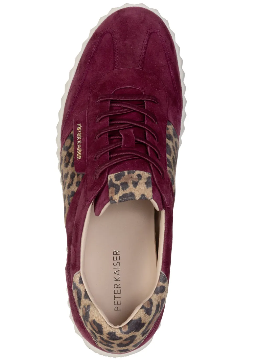Sneaker in Bordeaux-Braun aus Veloursleder, teilweise mit Leo-Print: Schnürung, Lederfutter, herausnehmbares Lederfußbett, leichte TPR-Laufsohle sowie 10 mm Keilabsatz