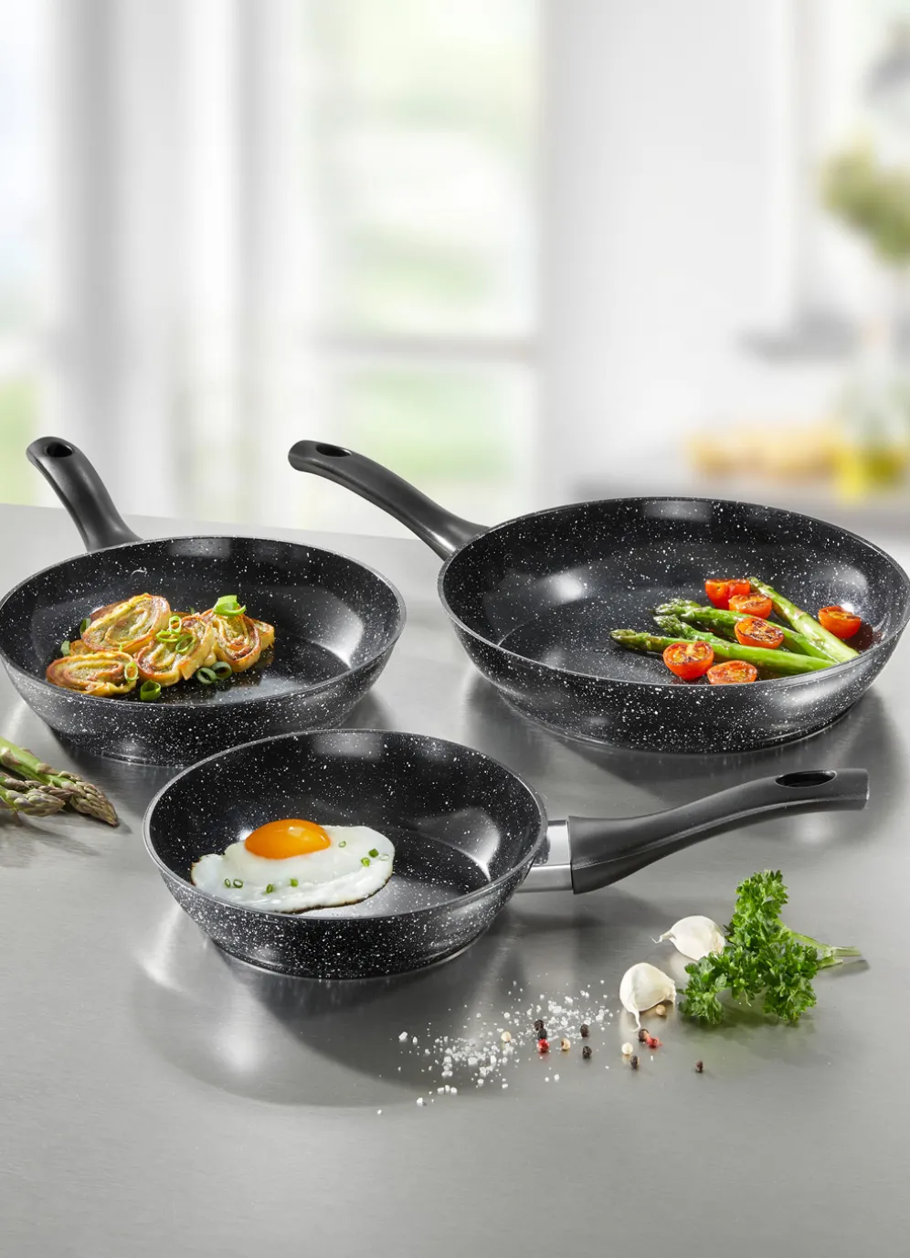 Aus hochwertigem, leicht geschmiedetem Aluminium, daher super energieeffizient dank kurzer Aufheizzeit. Spart Strom und somit bares Geld. Optimale Hitzeverteilung. Backofengeeignet bis 180 °C. Mit Cool-Touch- Griffen mit praktischer Aufhängeöse. Set aus: 3 Pfannen ø 20 cm/H4,2 cm, ø 24 cm/H4,5 cm, ø 28 cm/H5 cm. Spülmaschinengeeignet. Für alle Herdarten geeignet, auch Induktion.