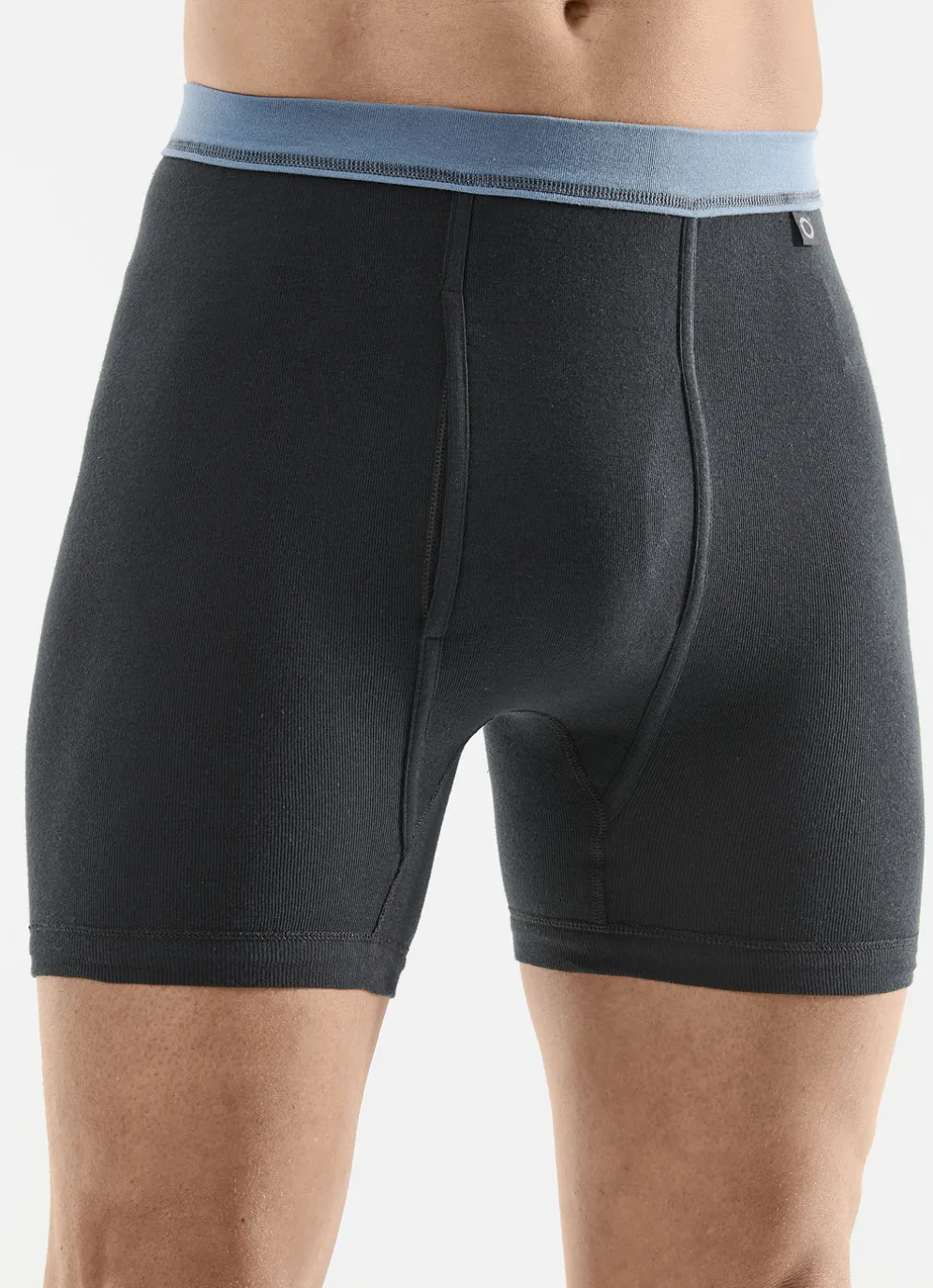 „Pfeilring”-Unterhose in Anthrazit-Jeansblau mit Label am Softbund, Schrittverstärkung sowie paspeliertem Eingriff.