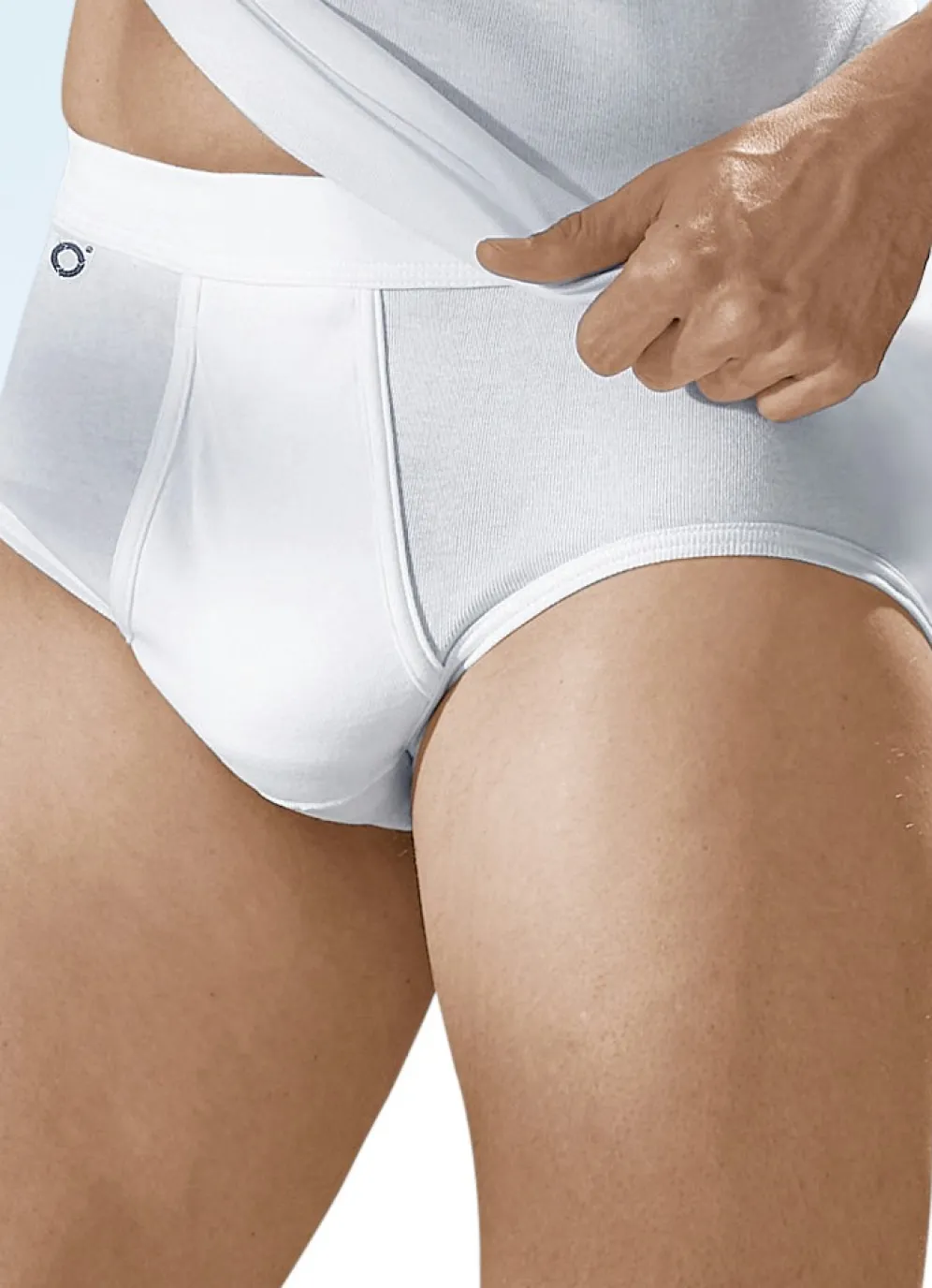 Tragangenehmer „Pfeilring“-Slip mit Label vorne am Softbund sowie mit paspeliertem Eingriff gearbeitet.