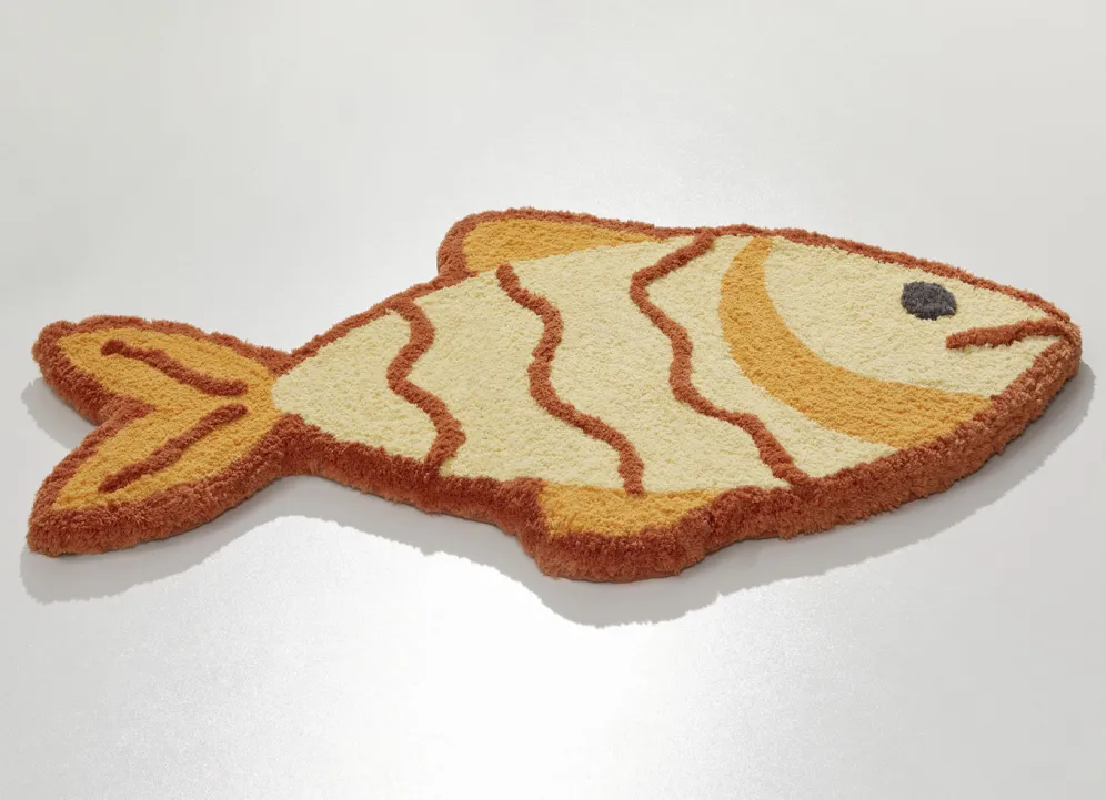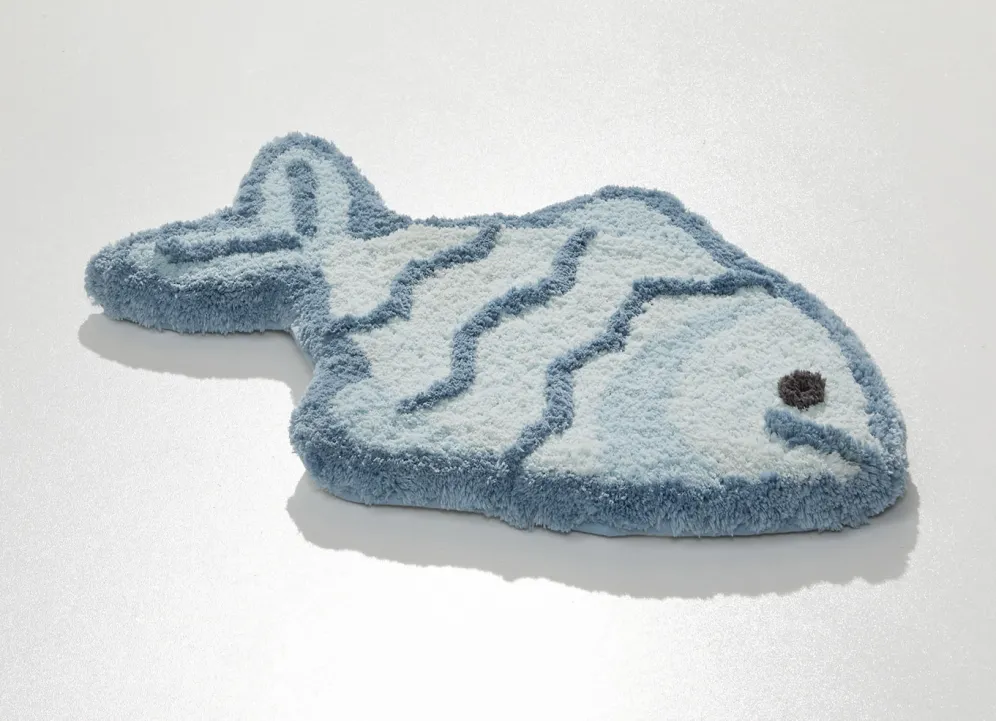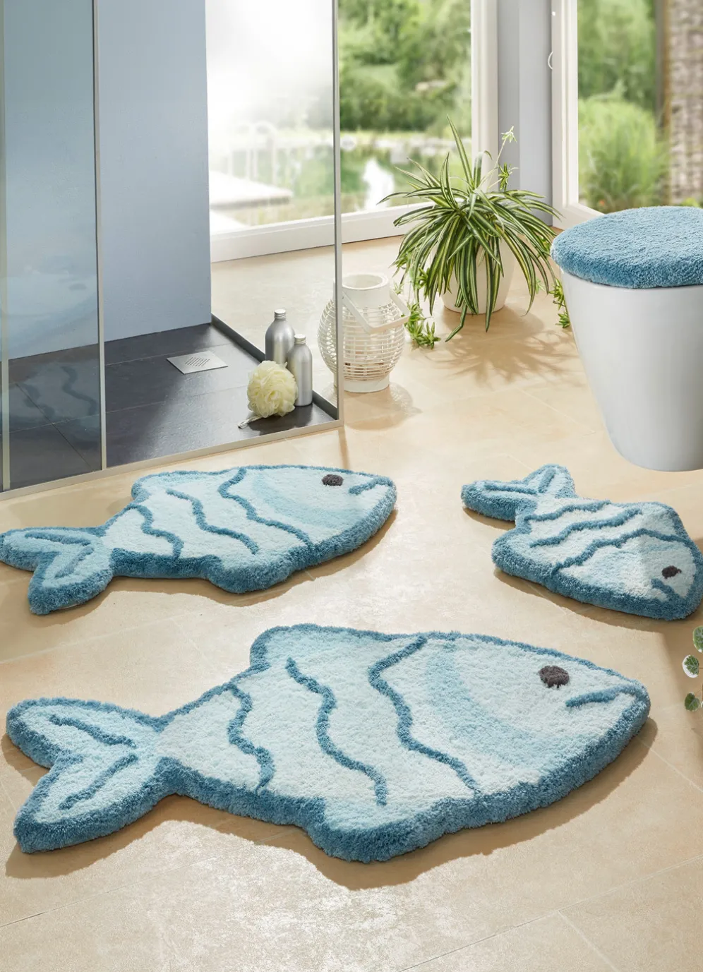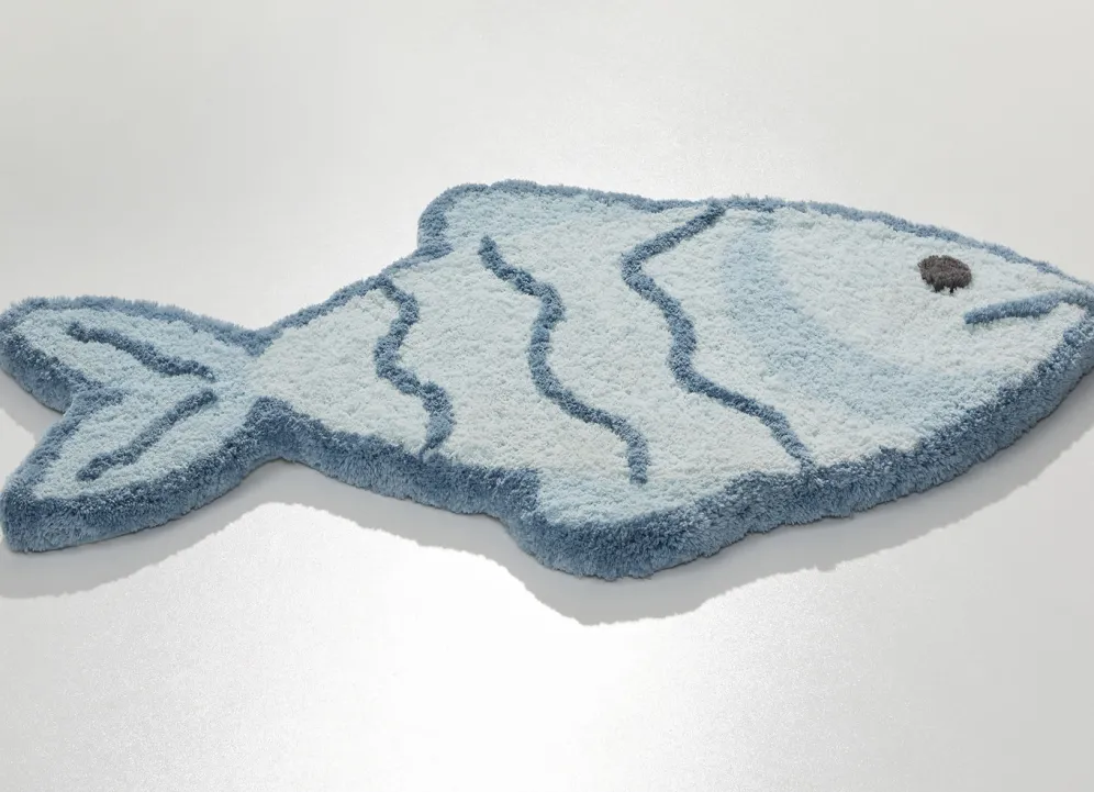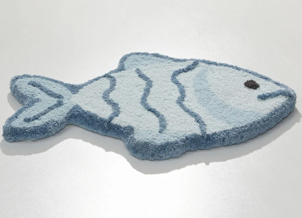 Diese lustige Badgarnitur in Form eines Fisches macht einfach gute Laune! Höhe: ca. 15 mm. Mit rutschhemmend latexierter Rückseite. Die herrlich weiche Qualität: Table Tuft aus 100% Premium-Polyester „Supersoft“. Waschbar bis 30 °C. Für Fußbodenheizung und Trockner geeignet. Pflegeleicht, flusen- und staubfrei, daher ideal für Allergiker
