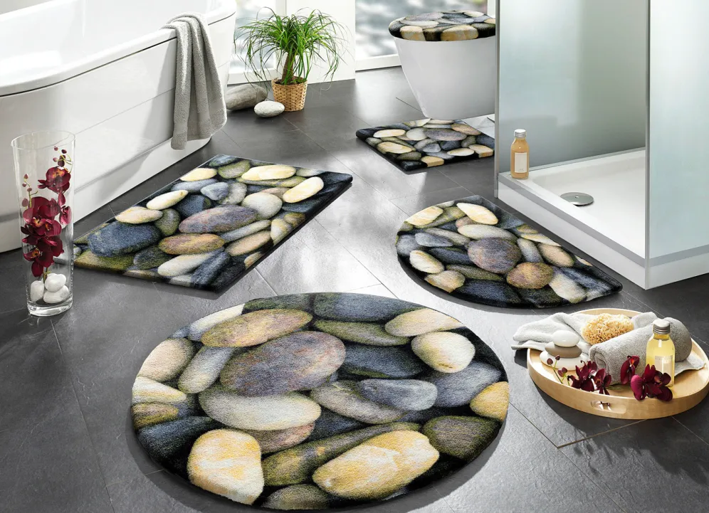 Ausdrucksvolle Motive in Form von naturgetreu dargestellten Kieselsteinen zeigen sich auf dieser tollen Badgarnitur, die mit schöner Bandeinfassung sowie latexbeschichteter, rutschhemmender Rückseite ausgestattet ist. Höhe 8 mm.