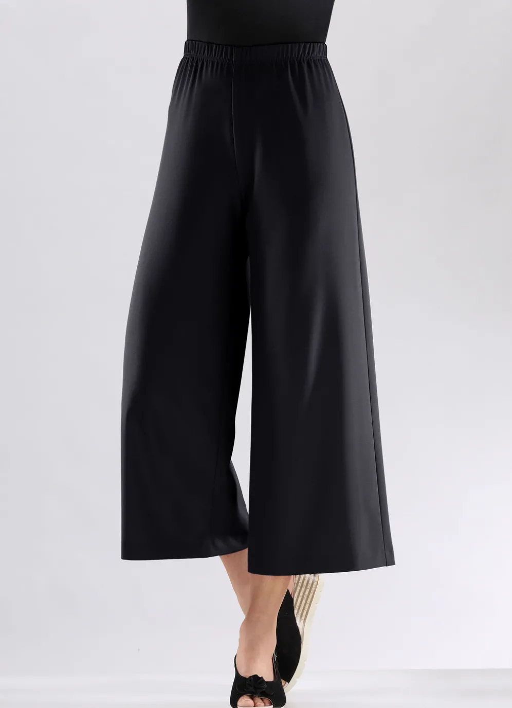 Angesagte, weich fließende Culotte: in bequemer Schlupfform, mit Dehnbund rundum sowie weitem, schön fallendem Saumabschluss, der diesem Modell seine feminine Eleganz verleiht. Länge ab Taille ca. 85 cm, bei K-Gr. ca. 79 cm.