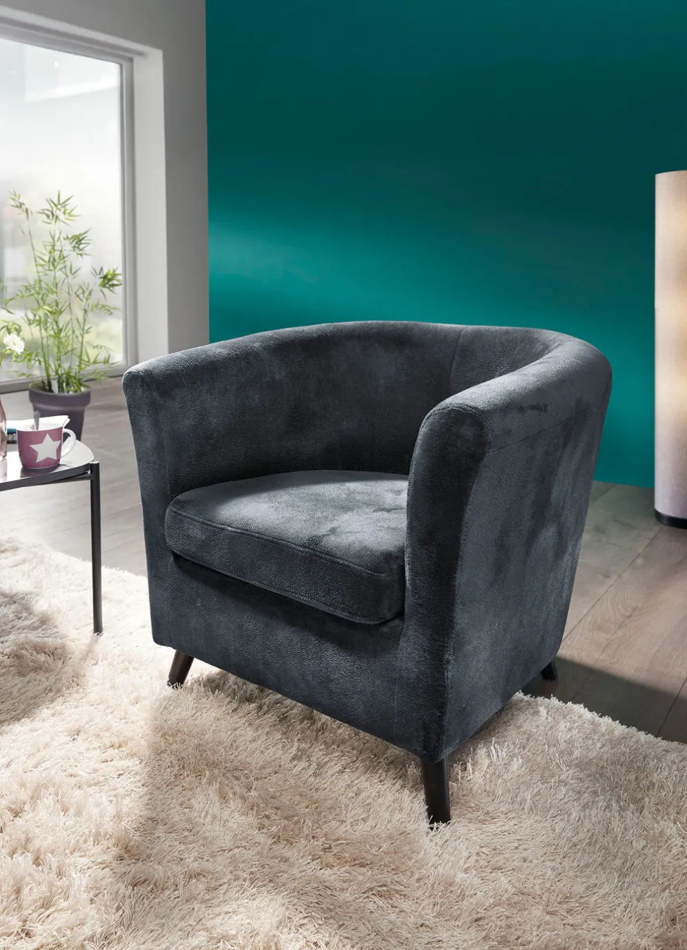 Ein trendstarker Blickfang in Ihrem Wohnraum wird dieser stilvolle Sessel werden! Auf stabilem Holzgrundgestell gefertigt, Sitzfläche und Rückteil aus Polyurethanschaum und Polstervlies gearbeitet. Der Rücken ist mit Originalstoff bezogen, daher frei im Raum aufstellbar. Auf 12 cm hohen Holzfüßen.