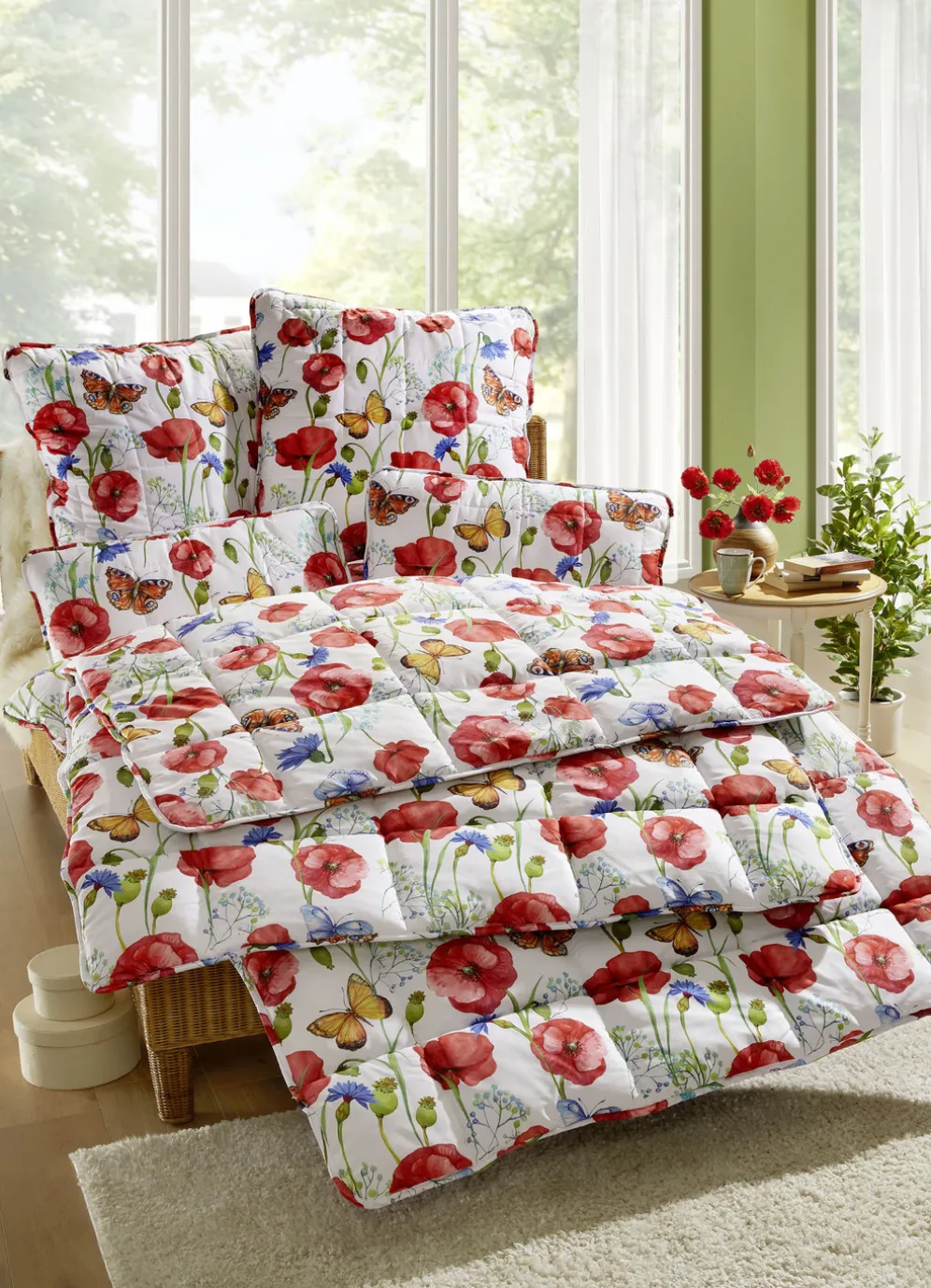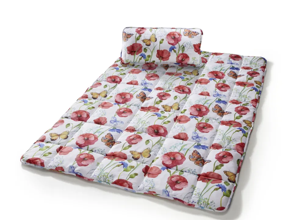 Dieses mit einem wundervollen Mohnblumen-Dessin beidseitig bedruckte, 2-teilige Bettwaren-Set ist auch ohne Bettwäsche zum Träumen schön! Kein Verrutschen der Füllung durch aufwendige Karo-Steppung. Mit farblich passender Bandeinfassung und Anti-Statik-Ausrüstung. Die pflegeleichte Qualität: Obermaterial aus angenehmer Mikrofaser (100% Polyester) mit Peach Touch-Effekt; Füllung Kissen: Faserkügelchen aus 100% Polyester; Füllung Decke: silikonisierte Hohlfaser aus 100% Polyester. Auch ideal als Gästebett geeignet. Waschbar bis 40 °C und trocknergeeignet.