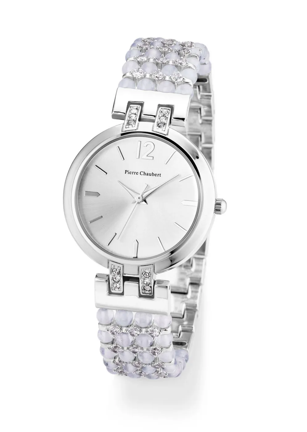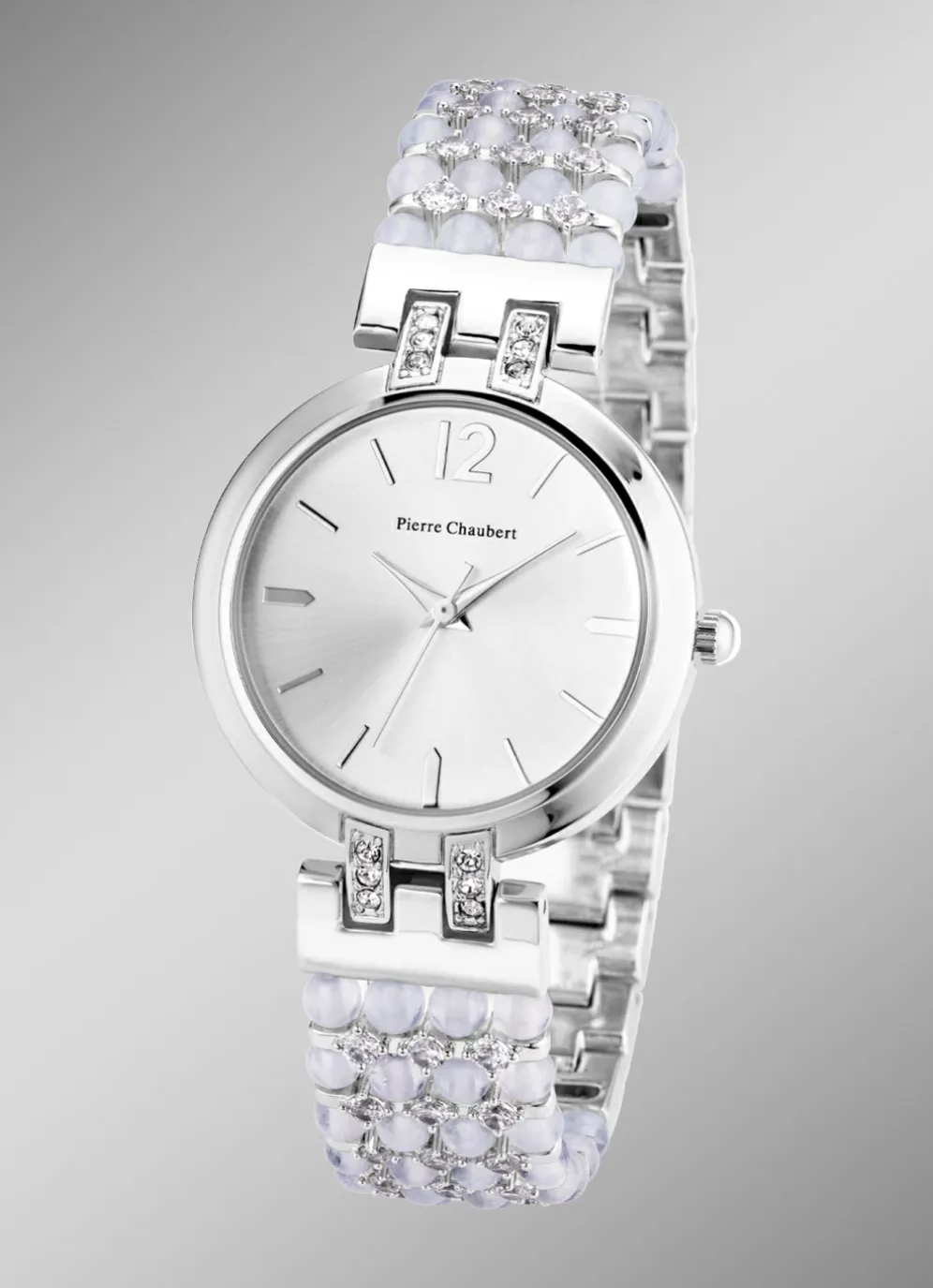 Pierre Chaubert-Quartz-Damenuhr. Mit Metallgehäuse und Metallband mit Clipverschluss. Echt Weißtopas, echt Aquamarin und weiße Kristalle zieren diese schicke Uhr. 19 cm lang, Ø 32 mm, spritzwassergeschützt