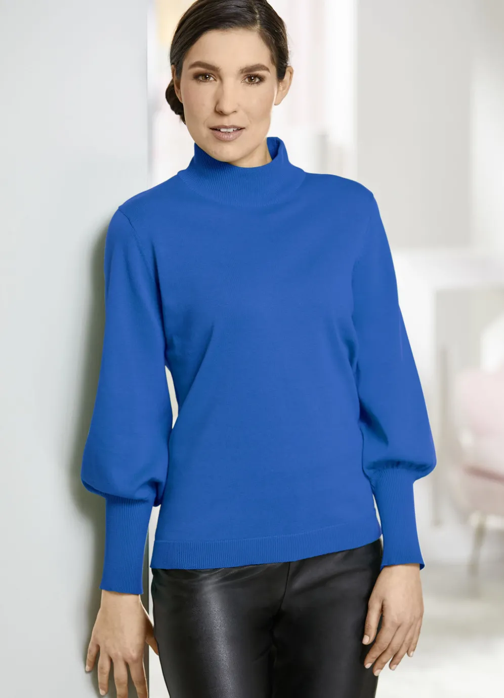 Außergewöhnlich und feminin wirkt dieser attraktive Pullover aus „Pima“-Baumwolle, mit Stehbund, langen Ballonärmeln mit hohem Bund zum Aufschoppen sowie schmalem Rippenbund am Saum.