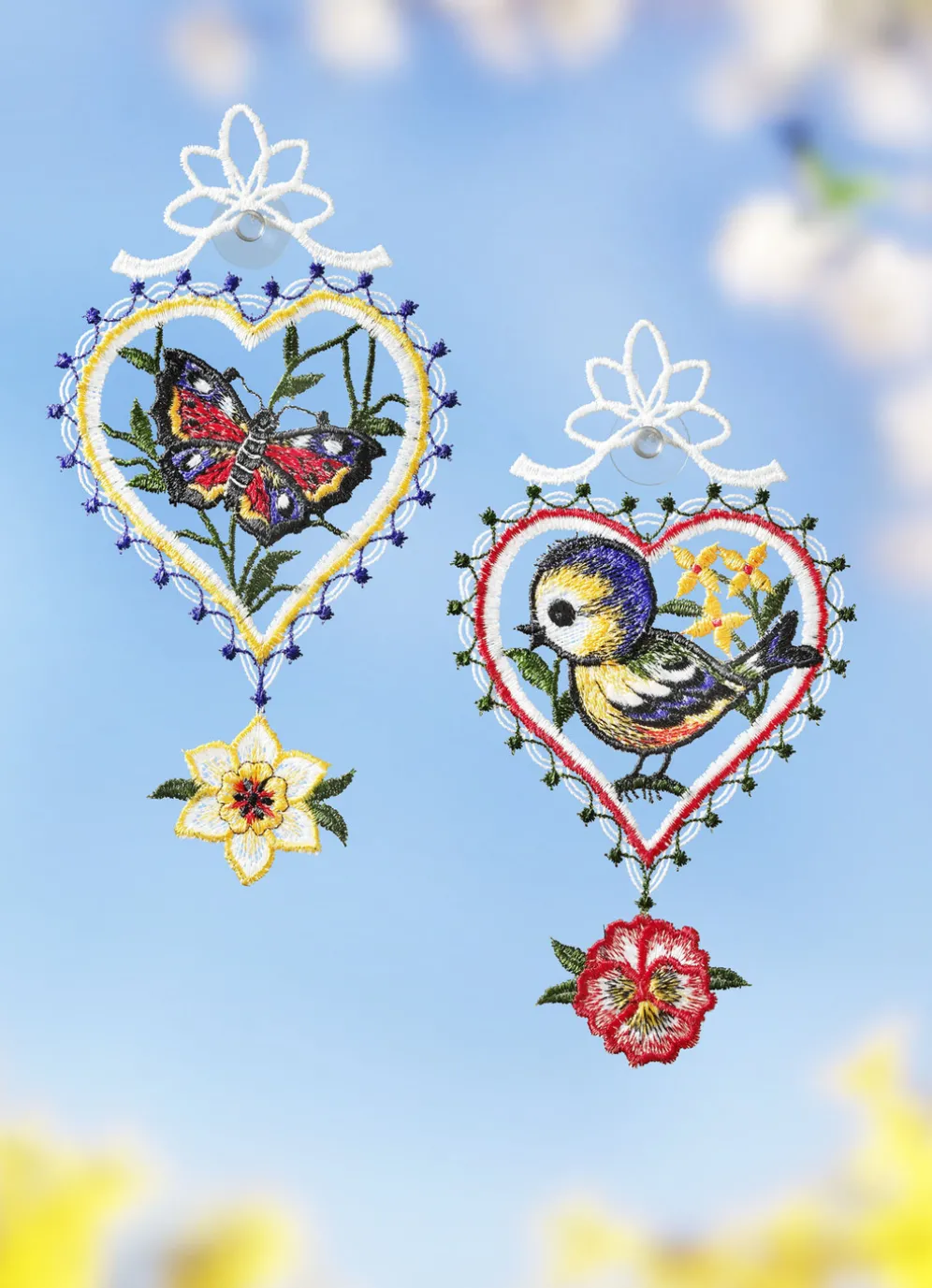 Gefertigt aus echter Plauener Spitze zeigen diese beiden Fensterbilder in Herzform in der Mitte ein kleines Vögelchen bzw. einen Schmetterling. Die beiden reizenden Kunstwerke sind in tollen Farben gestaltet. Qualität: 100% Polyester. Mit Saughaken zur einfachen Befestigung.