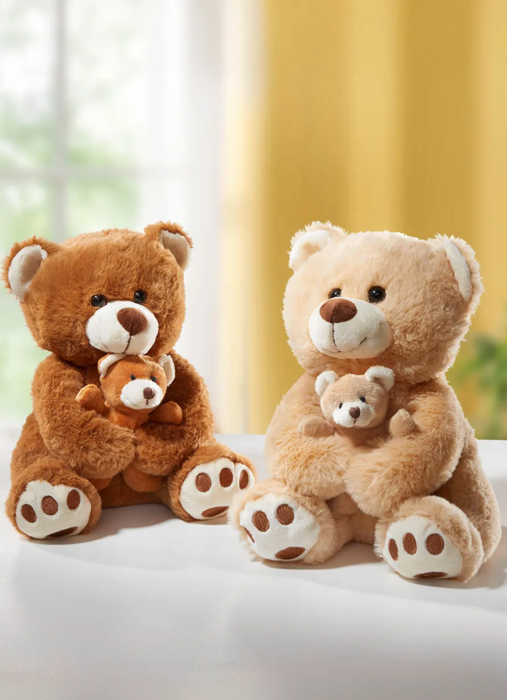Diese flauschigen Plüschteddybären im 2er-Set werden Sie begeistern. Das Highlight sind die kleinen Baby-Bären die die Teddys jeweils in der Hand halten. Mit glänzenden Augen und aus weichem Plüsch-Material gefertigt. Maße: Je ca. Höhe 24 cm.