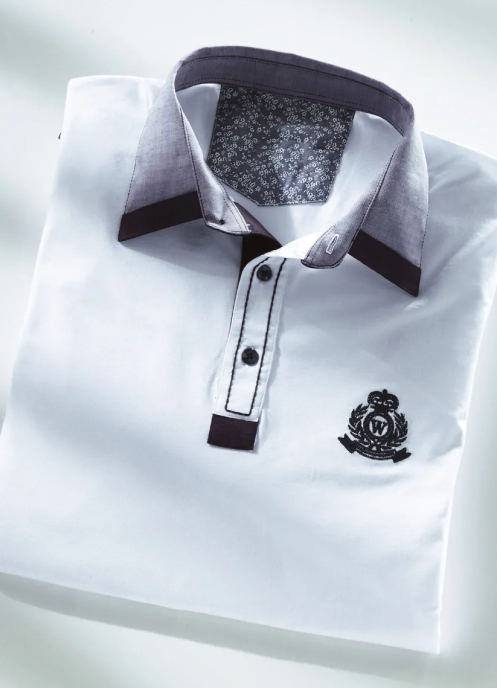 Große Klasse ist dieses Poloshirt mit gewebtem Hemdkragen und kurzer Knopfleiste mit Kontrastnaht, Kontrastbesätzen an der Schulterpartie, Kontraststickerei im Vorderteil sowie Bündchen-Abschlüssen an den kurzen Ärmeln.