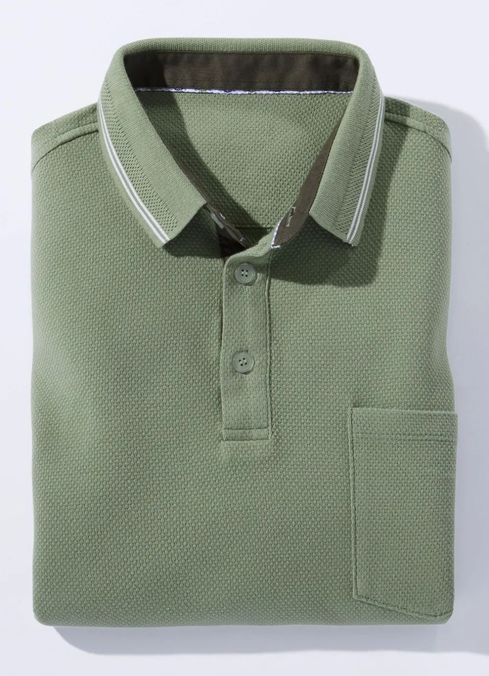Attraktives Poloshirt mit Strickkragen, kurzer Knopfleiste, einer aufgesetzten Brusttasche links, Bündchen-Abschlüssen an den Ärmeln sowie kleinen Seitenschlitzen.