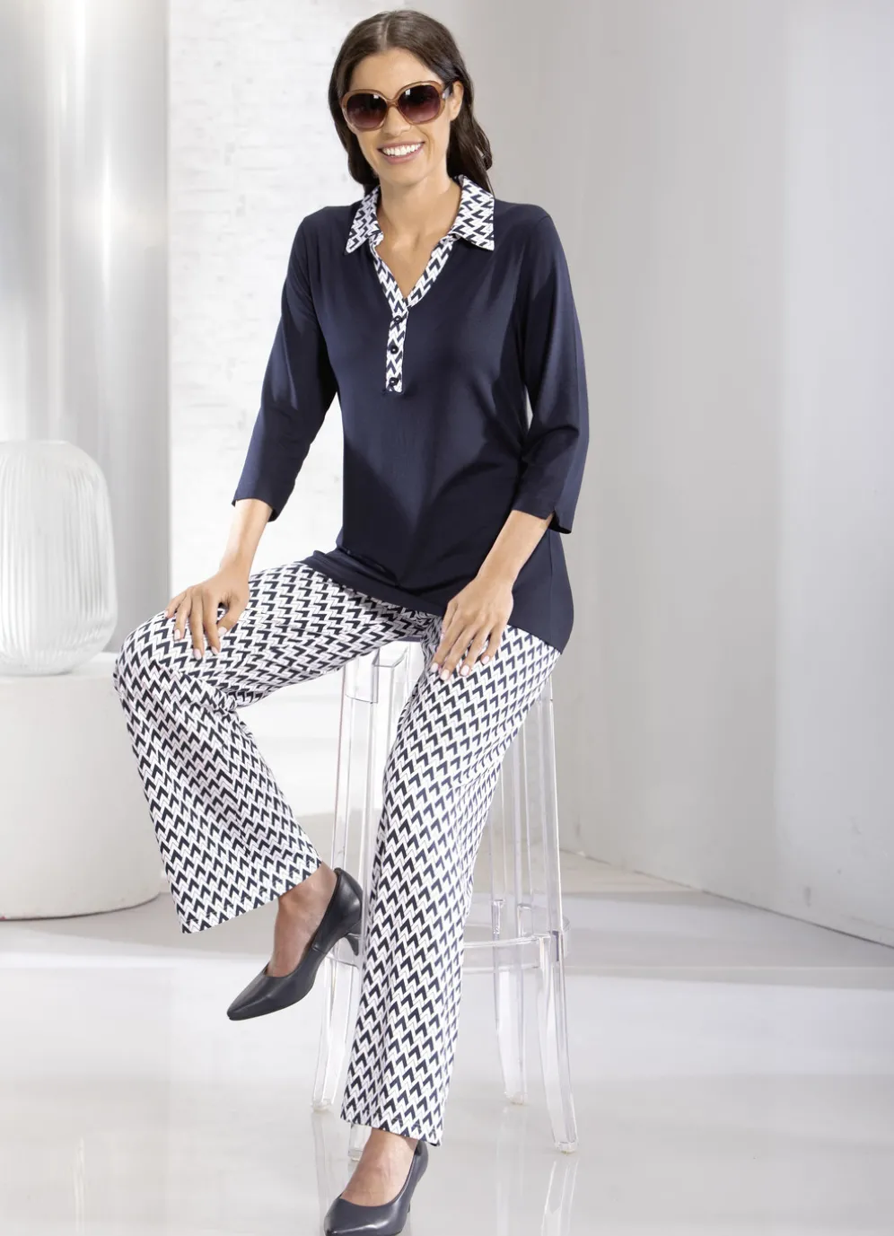 Ein absolutes Highlight ist dieses hinreißende Poloshirt in Marine, mit kontrastfarbenem Kragen, Knopfzierblende am V-Ausschnitt sowie 3/4-langen Ärmeln.