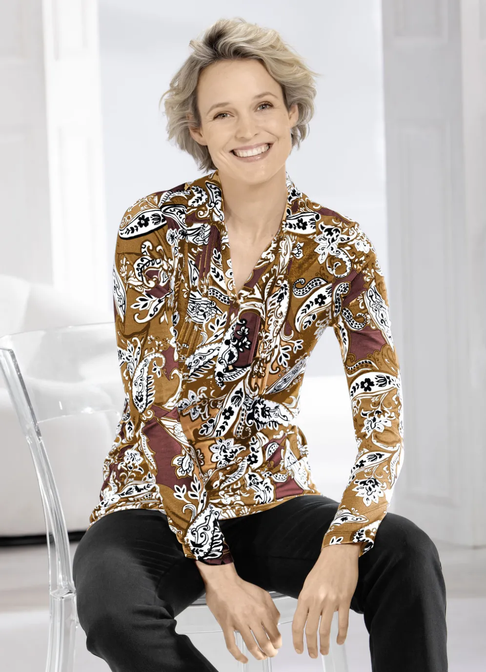 Jedes Teil ein Unikat! Große Klasse ist dieses fabelhafte Poloshirt mit V-Ausschnitt und kurzer Zierknopfleiste sowie Biesenverarbeitung im Vorderteil.
