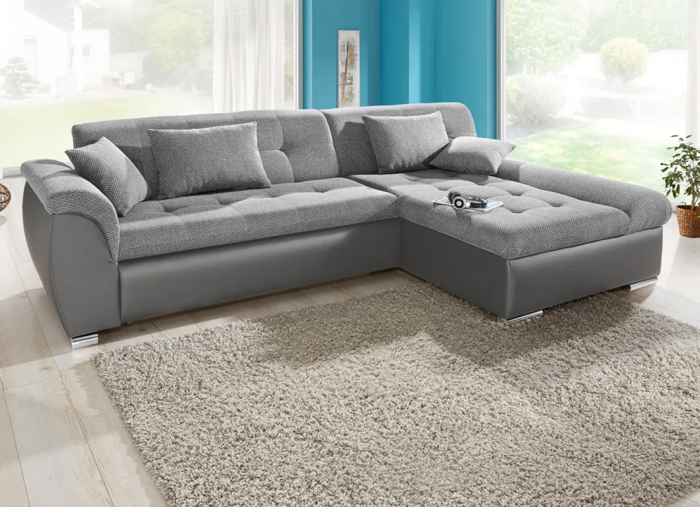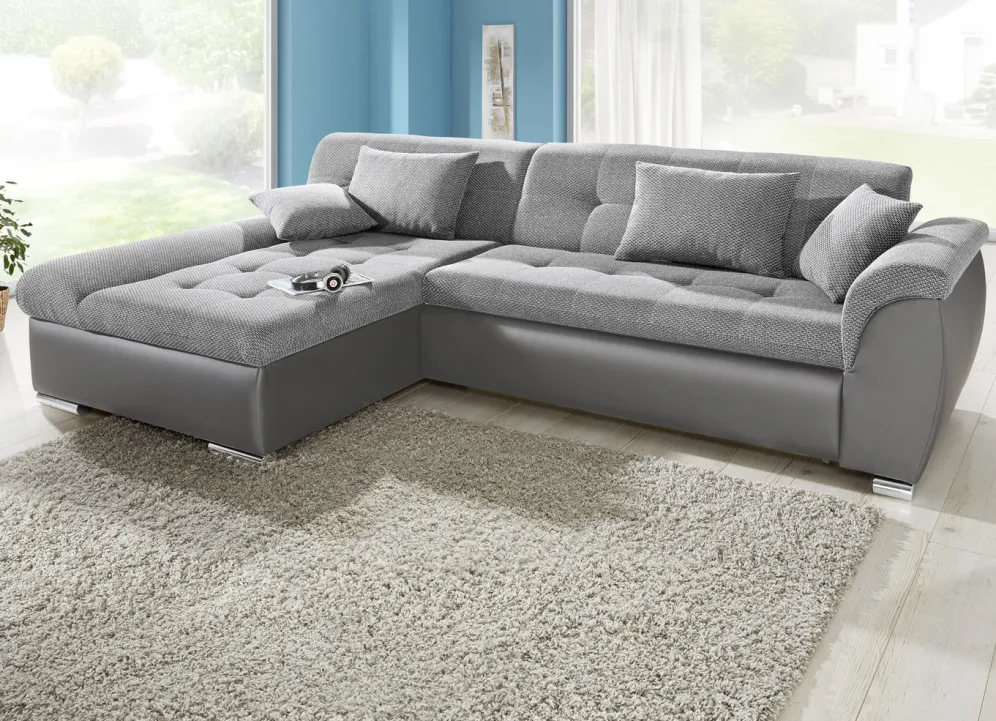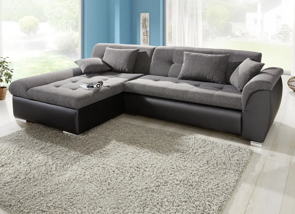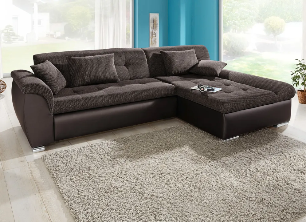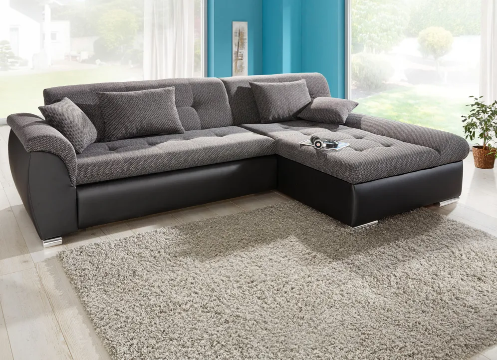 Setzen Sie einen gemütlichen und geschmackvollen Akzent in Ihrem Zuhause – mit dieser tollen Polsterecke mit komfortabler Bettfunktion. Auf stabilem Holzgrundgestell, mit Bettkasten, auf bequemer Wellenunterfederung mit Federkern. Sitz- und Rückenfläche mit angenehmem Webstoffbezug (100% Polyester), Korpus mit apartem Kunstleder (100% Polyurethan) versehen. Die Rückseiten sind mit Originalstoff bezogen, daher frei im Raum aufstellbar. Auf verchromten Metallfüßen.
