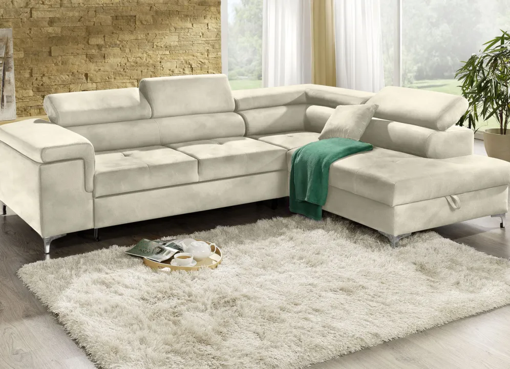 Ideal zum Ausruhen oder auch als komfortables Gästebett. Diese exquisite Polsterecke mit bequemer Bettfunktion und Bettkasten unter der Ottomane lässt sich schnell und einfach in eine gemütliche Schlafgelegenheit verwandeln. Auf stabilem Holzgrundgestell gearbeitet. Mit Wellenfederung und hochwertiger Komfortschaum-Polsterung ausgestattet. Sehr ansprechender Stoffbezug (100% Polyester). Mit 3 verstellbaren Kopfstützen. Die Rückseiten sind mit Originalstoff bezogen, daher frei im Raum aufstellbar. Auf 10 cm hohen Metallfüßen.