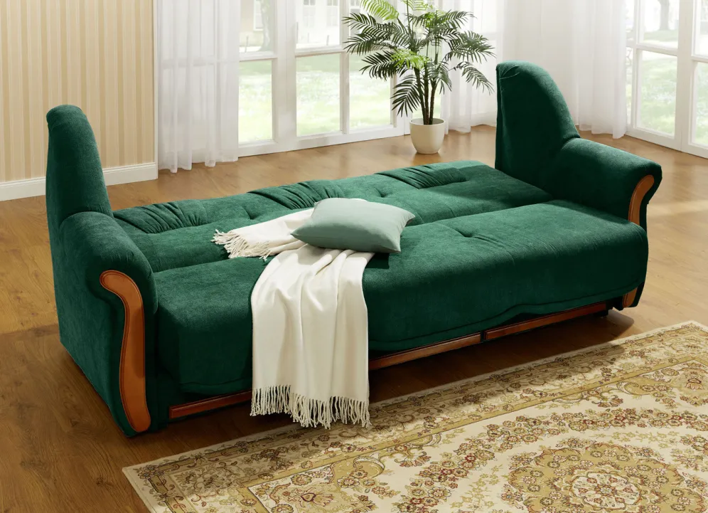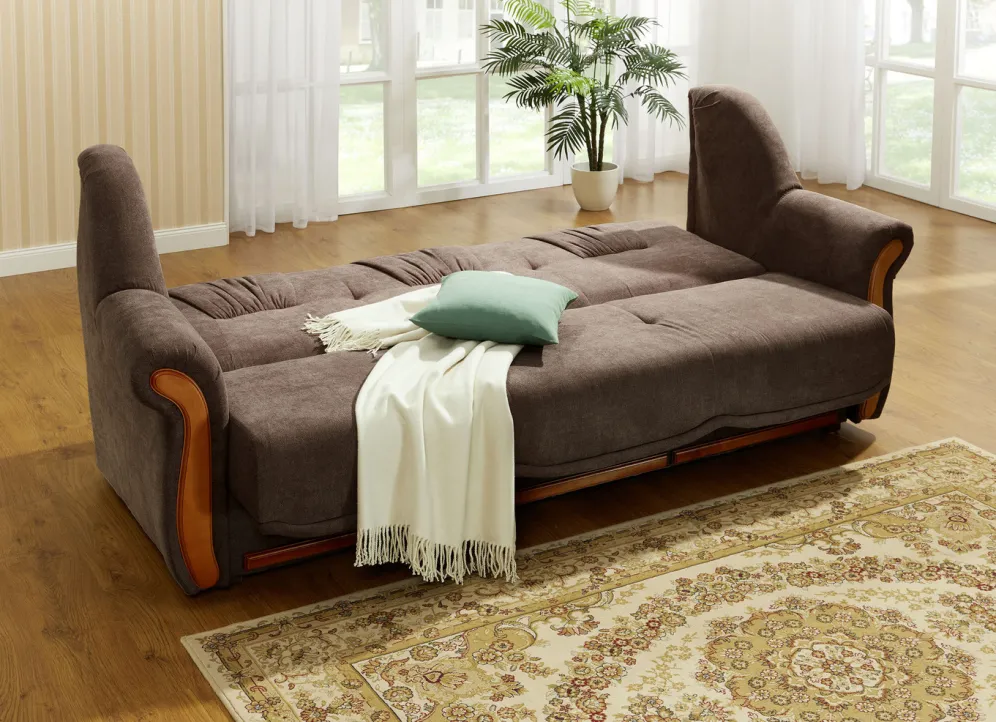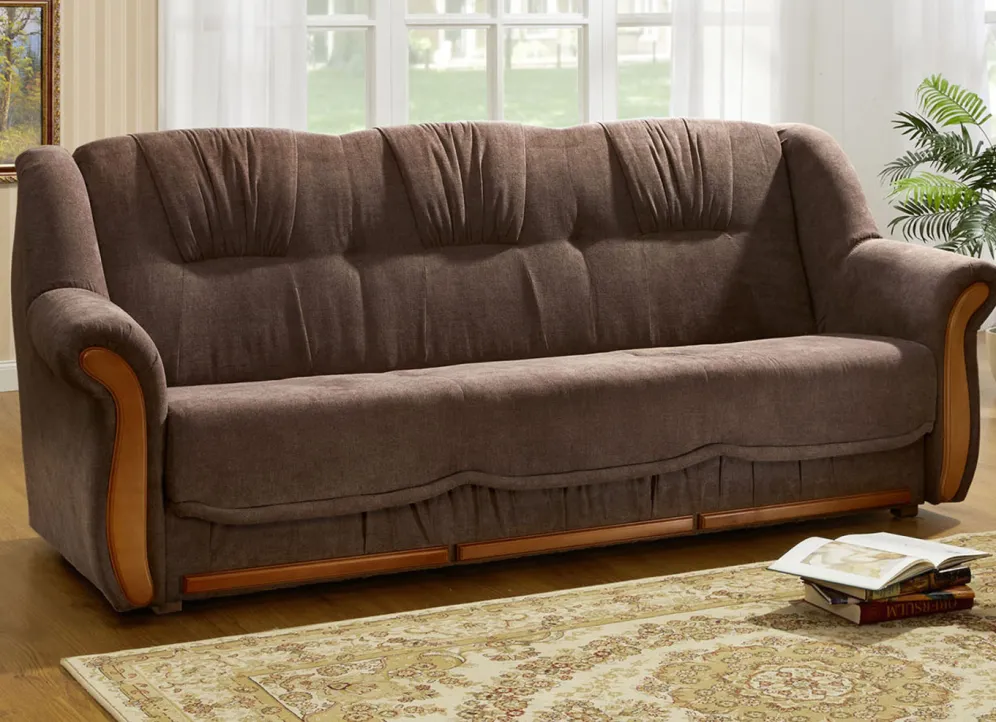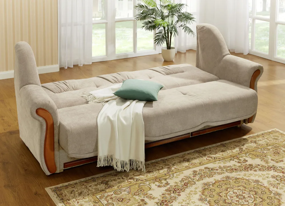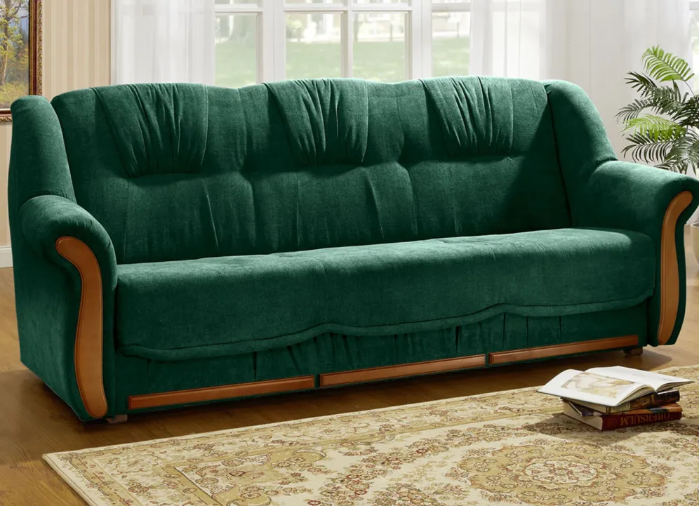 Der Dreisitzer ist mit bequemer Bettfunktion (Liegefläche 120×195 cm) sowie mit praktischem Stauraum im Bettkasten ausgestattet. Mit dekorativen Holz-Chatosen aus Erlenholz. Auf Holzfüßen.