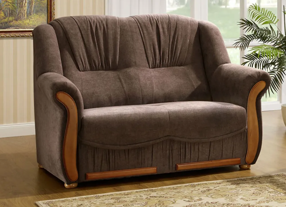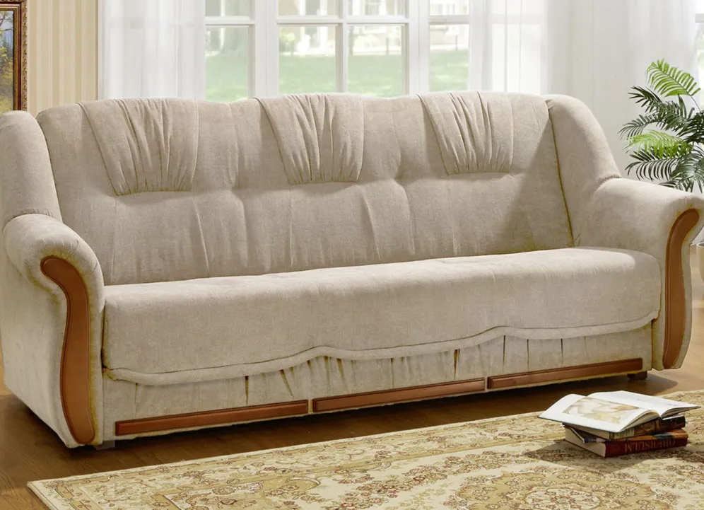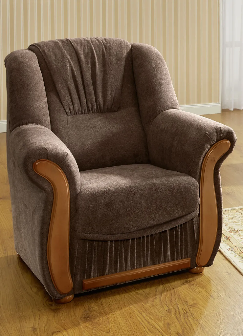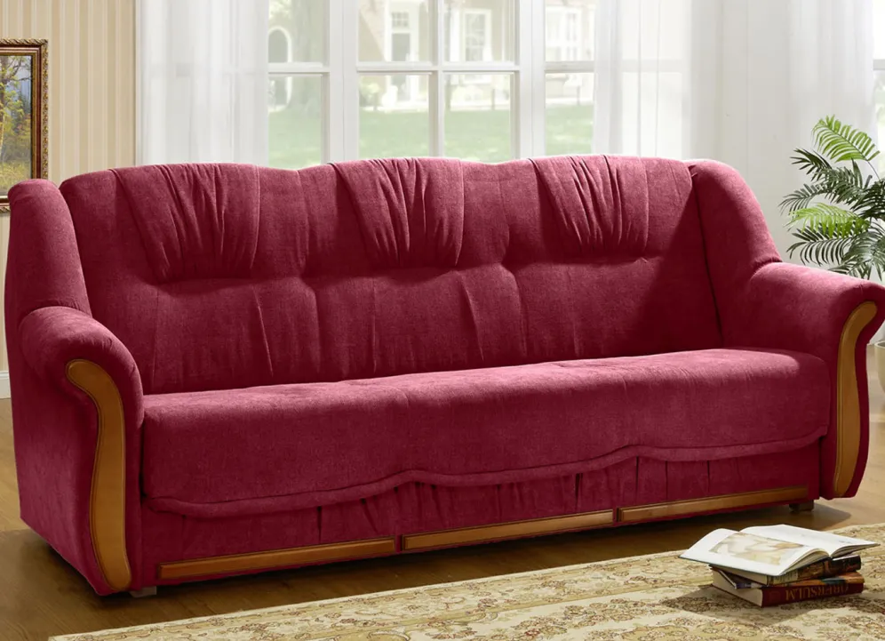 Der Dreisitzer ist mit bequemer Bettfunktion (Liegefläche 120×195 cm) sowie mit praktischem Stauraum im Bettkasten ausgestattet. Mit dekorativen Holz-Chatosen aus Erlenholz. Auf Holzfüßen.