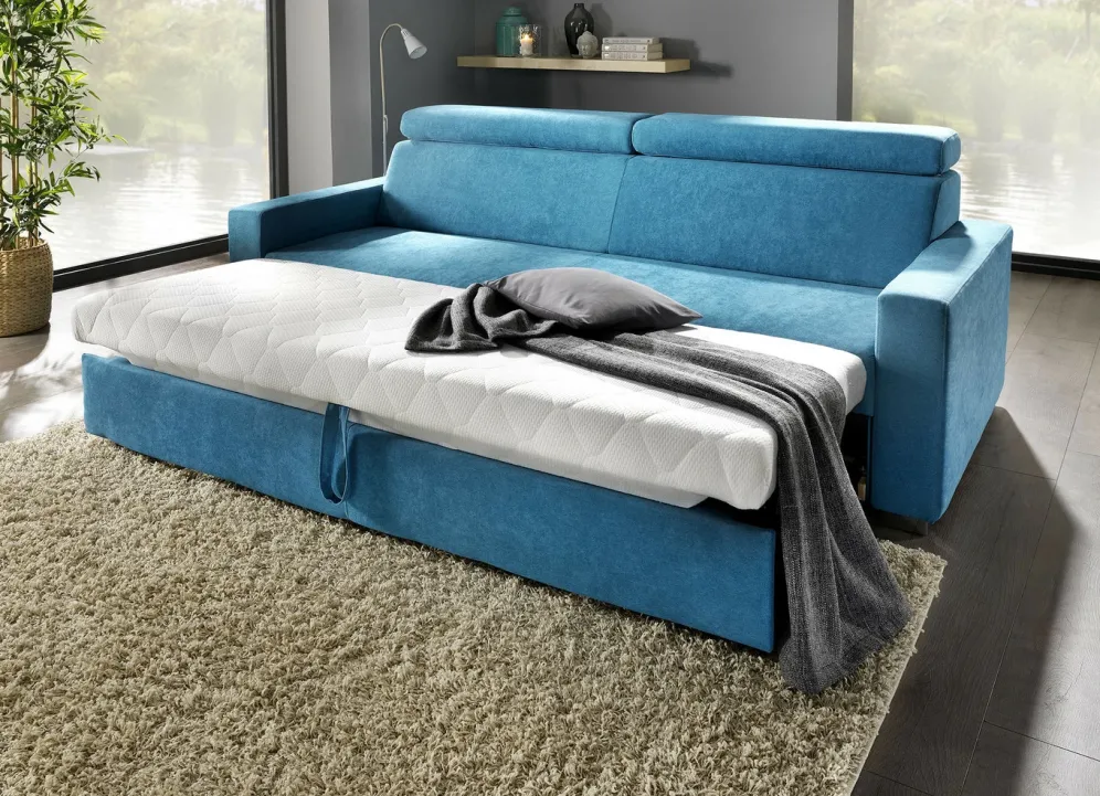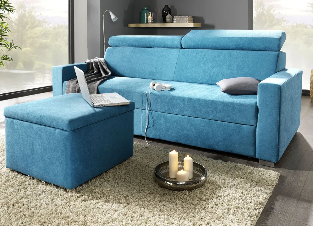 Polstermöbel mit Bettfunktion und verstellbaren Kopfstützen in der Ausführung Schlafsofa mit Hocker und in Blau.