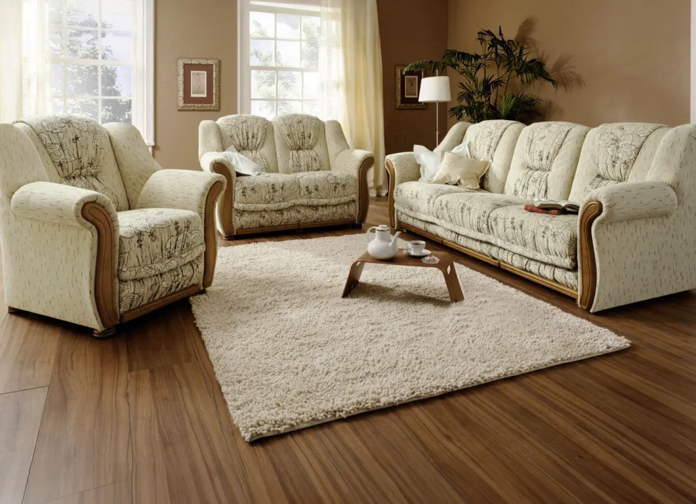 Polstermöbel auf stabilem, teilmassivem Holzgrundgestell, mit hochwertiger Federkernpolsterung und dekorativen Holz-Chatosen. Auf Holzfüßen. Chenillebezug aus 58% Polyester, 32% Acryl, 10% Baumwolle. Dreisitzer und Polsterecke mit Bettfunktion und Bettkasten, Rückseiten mit Spannstoff bezogen. Einfache Endmontage.