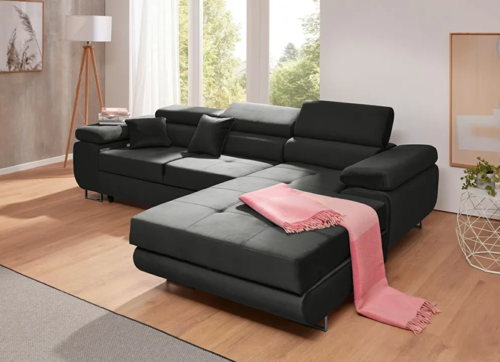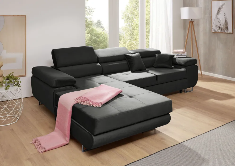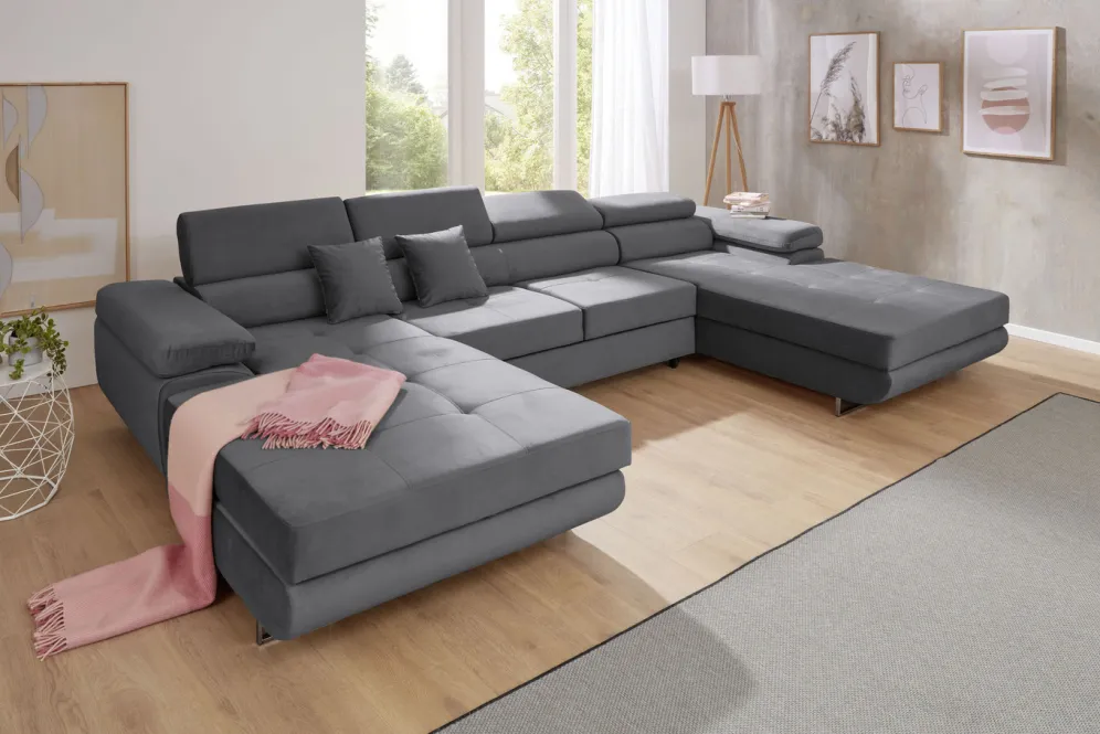 Polstermöbel mit Funktion und verstellbaren Kopfstützen in der Ausführung Polsterecke, 275×203 cm und in Anthrazit.