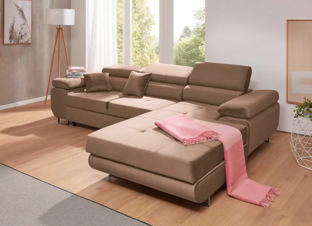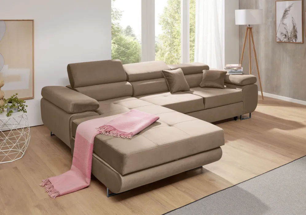 Sehr attraktive Polstermöbel auf stabilem Holzgrundgestell, mit robuster Wellenfederung sowie hochwertiger Komfortschaum-Polsterung. Mit praktischer Bettfunktion und und 1 Bettkasten bei der Polsterecke. Angenehmer Bezug aus 100% Polyester mit moderner Steppung. Die Polsterecke ist mit 3 verstellbaren Kopfstützen ausgestattet. Die Rückseiten sind mit Originalstoff bezogen, daher frei im Raum aufstellbar. Auf verchromten Metallfüßen. Maße: je Höhe 90 cm; Sitzhöhe 43 cm, Sitztiefe 56 cm. Einfache Endmontage