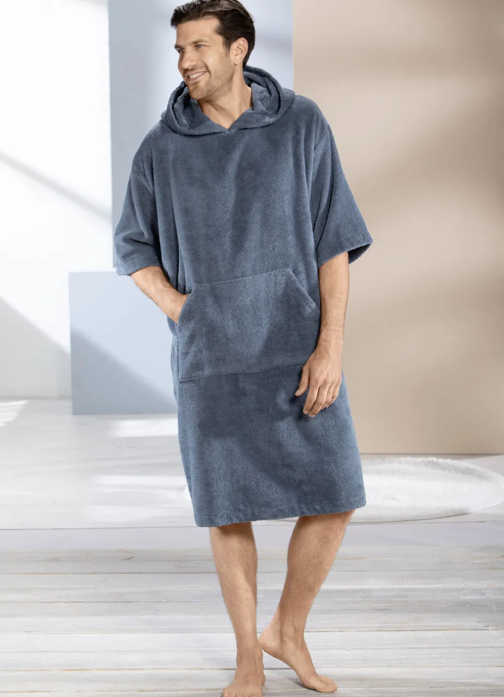 Bequemer, wadenlanger Poncho in Rauchblau, ermöglicht ein einfaches Überstülpen: mit Kapuze, einer Kängurutasche sowie 3/4-langen Ärmeln.