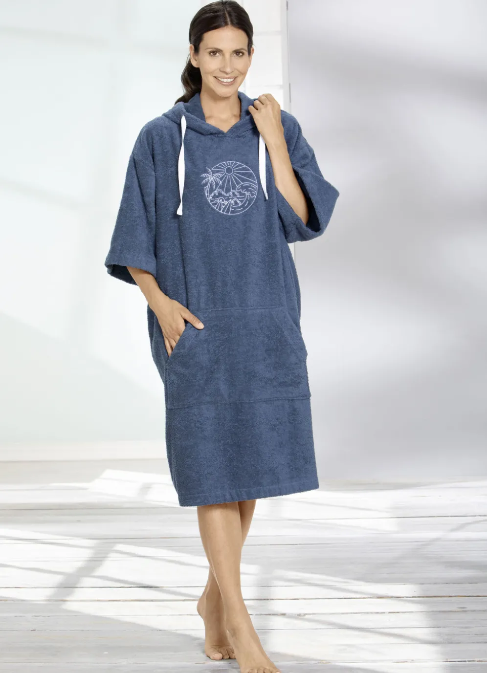 Trendiger, wadenlanger Laurina-Poncho in Rauchblau: Schlupfform, Kapuze mit Bindeband, überschnittene Schultern mit 3/4-langen Ärmeln, platzierter Druck im Vorderteil sowie eine Känguru-Tasche.