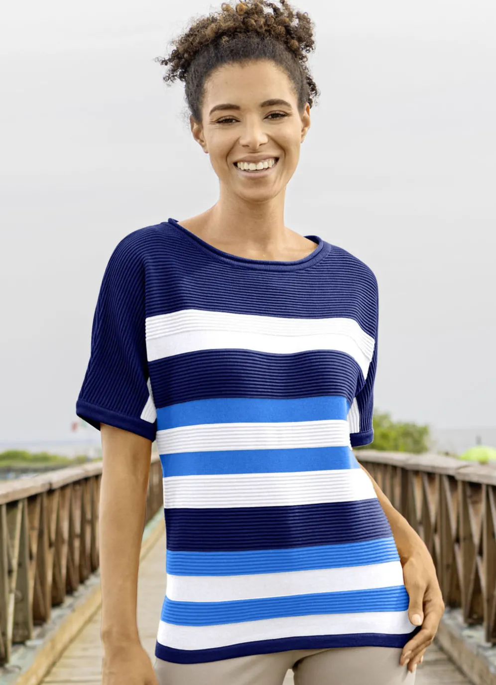 Bezaubernder Pulli mit attraktivem Strukturmustermix in Streifenoptik allover, rundem Halsausschnitt mit Rollkante sowie kurzen Fledermausärmeln.