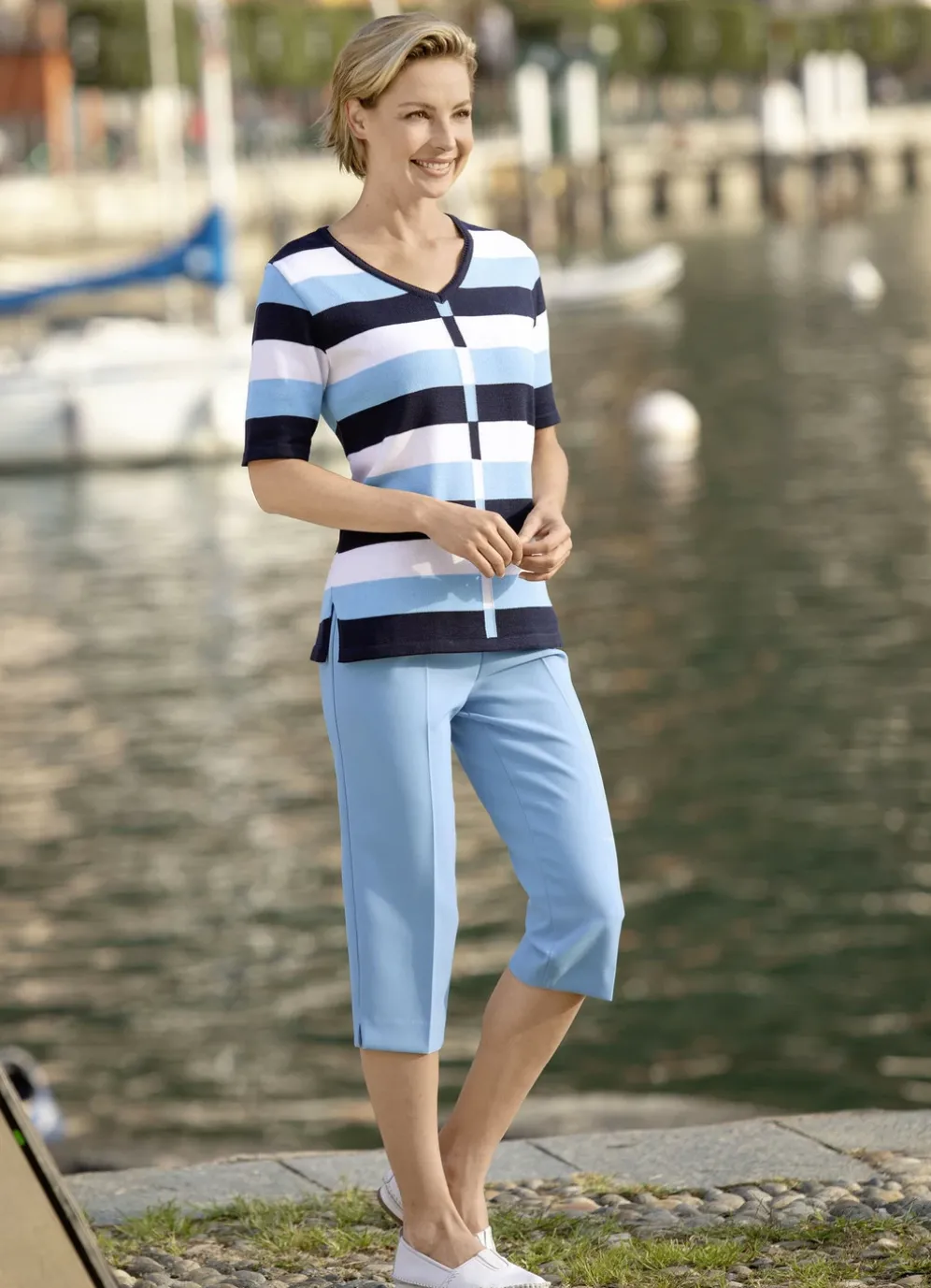 Wundervoller Pulli: V-Ausschnitt mit feinem Ajourabschluss, unterbrochenes Streifendessin im Vorderteil sowie kurze Ärmel und Rückteil mit Streifendessin.