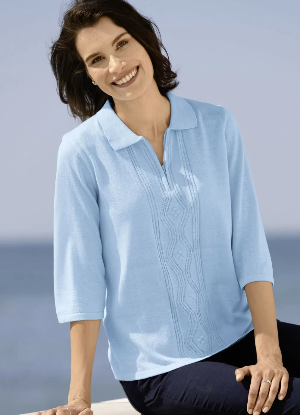 Dezent glänzender Pullover mit hübschem, streckendem Strukturmuster in der Mitte des Vorderteils, Polokragen mit verdecktem Reißverschluss sowie 3/4-langen Ärmeln.