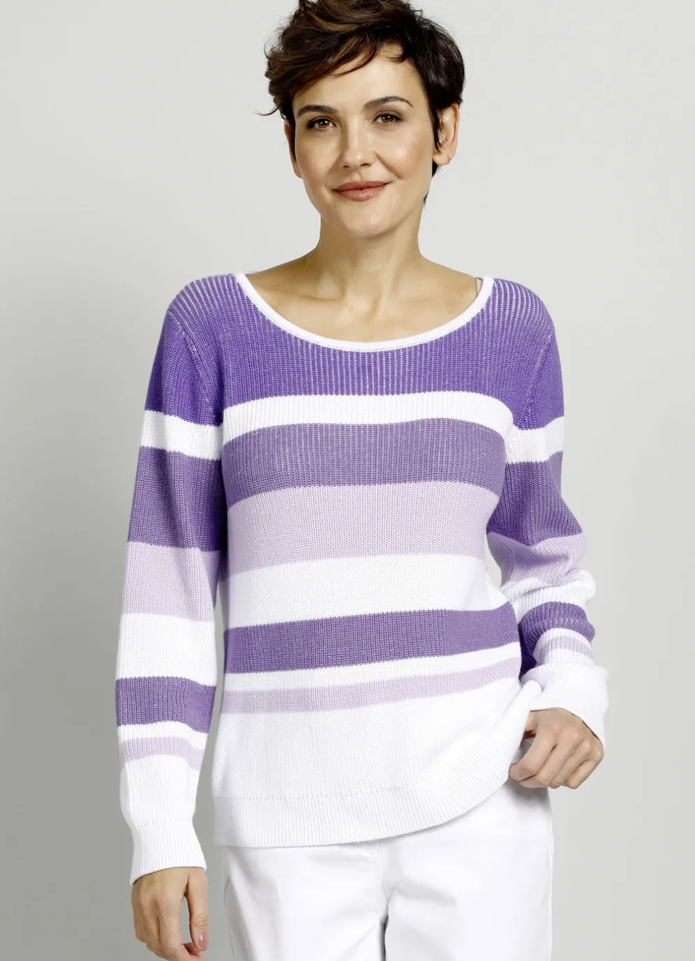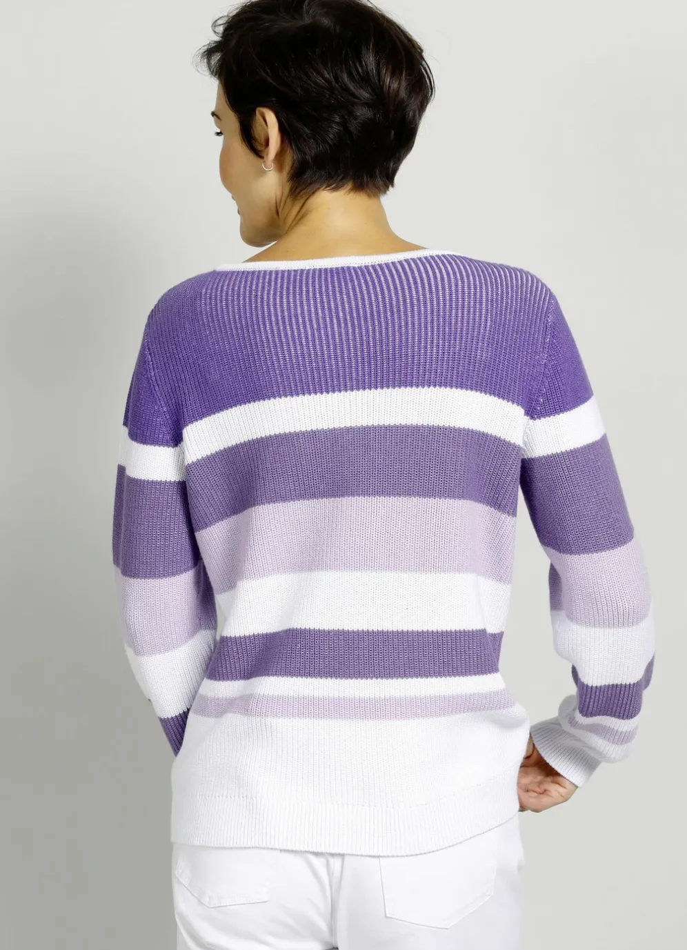Pullover aus reiner Baumwolle in Lila-Weiss und in Größe 46.