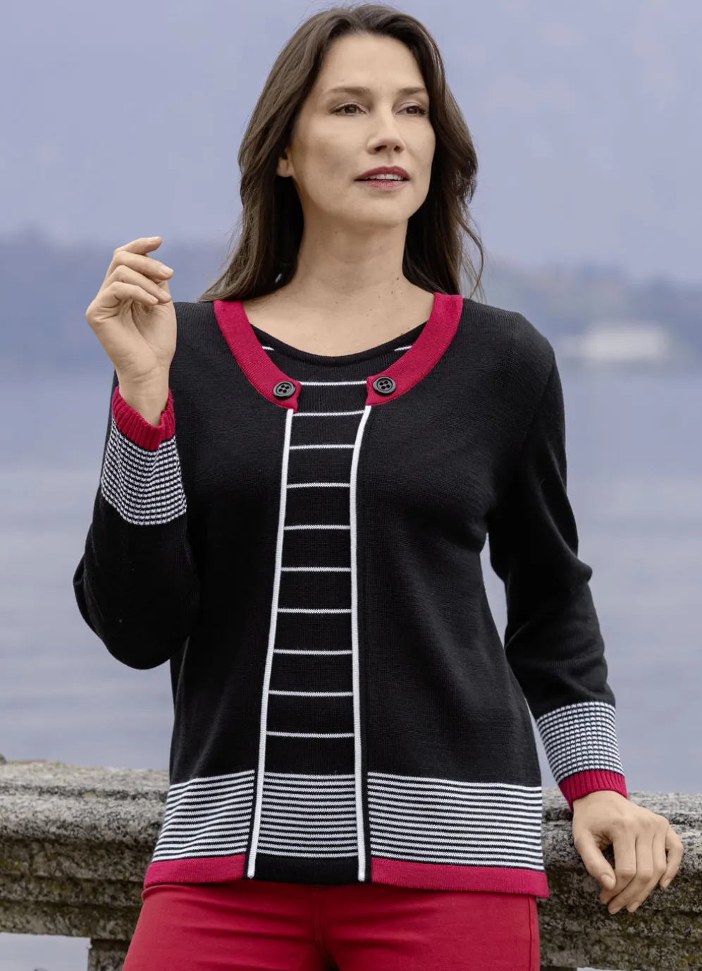 Schwarz-rot-weißer Pullover in Doppel-Optik: unterlegter, runder Halsausschnitt mit gestreiftem Einsatz im Vorderteil, Kontrastkragenblende mit Zierknöpfen sowie gestreifte Abschlüsse in Bordürenoptik an den langen Ärmeln und am Saum.