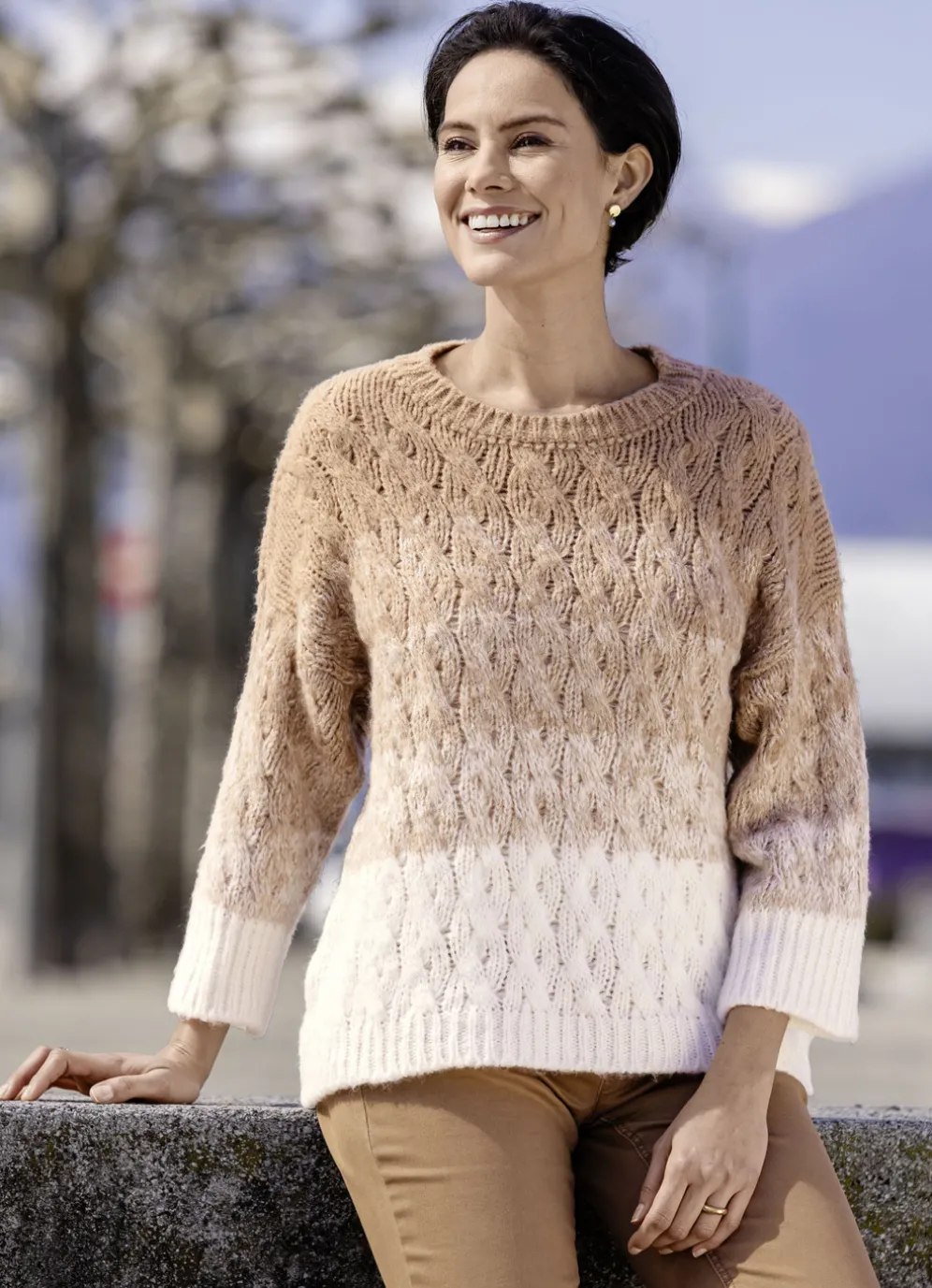 Ein Kuschelfavorit ist dieser Pullover von laurakent in Camel-Ecru: runder Halsausschnitt, überschnittene Schulterpartie, hübsches Strukturmuster im streckenden Zopfdessin und im Farbverlauf allover, etwas weitere Ärmel in modischer Länge, gerippte Abschlüsse.