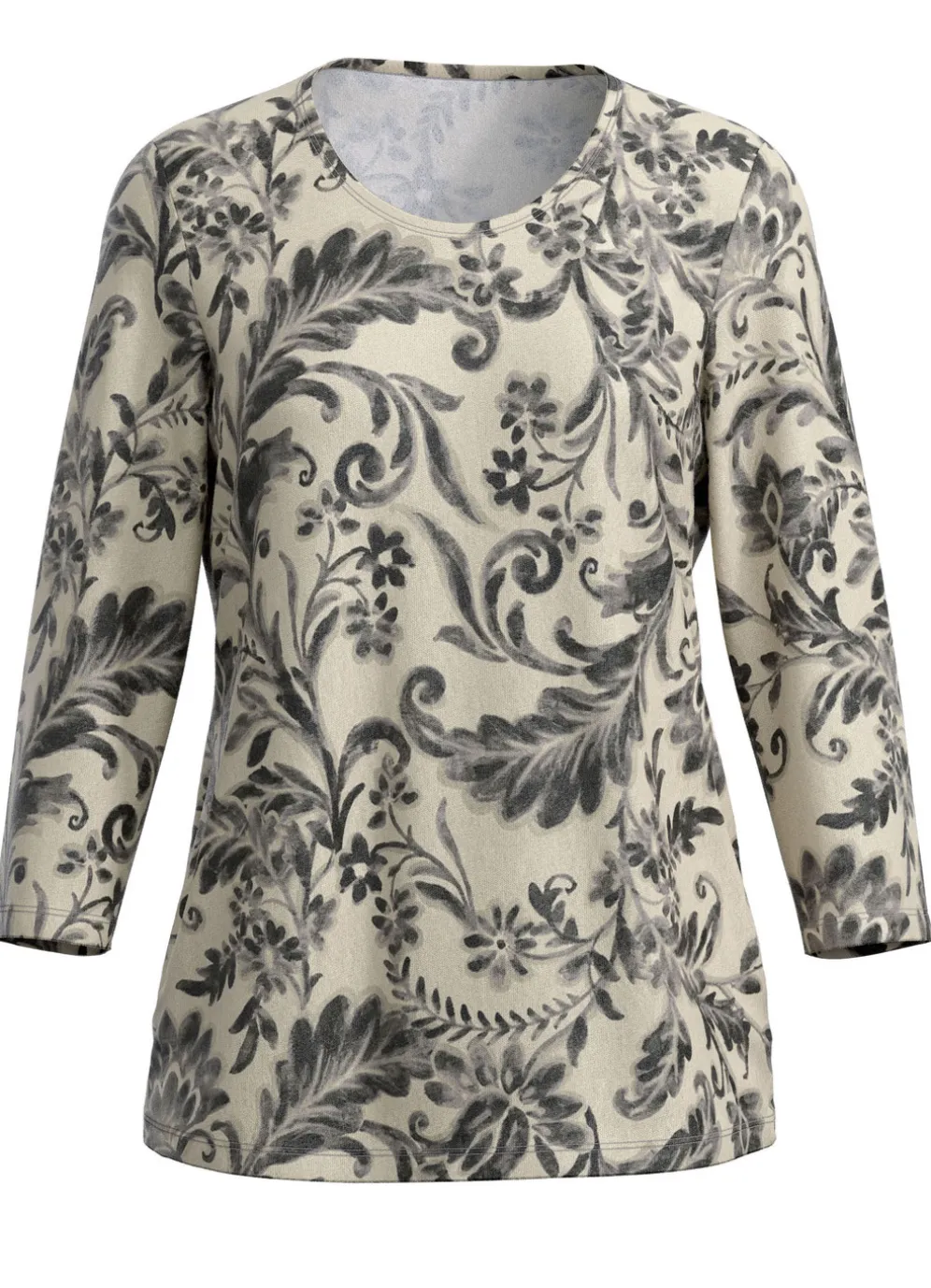Jedes Teil ein Unikat! Creme-Schwarzer Pullover mit dezentem Alloverdruck in floralem Dessin, rundem Halsausschnitt sowie 3/4-langen Ärmeln.