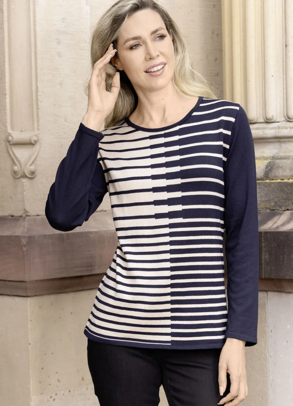 Herrlicher Pullover von laurakent mit grafischem Muster in Streifenoptik im Vorderteil, rundem Halsausschnitt sowie langen Ärmeln.