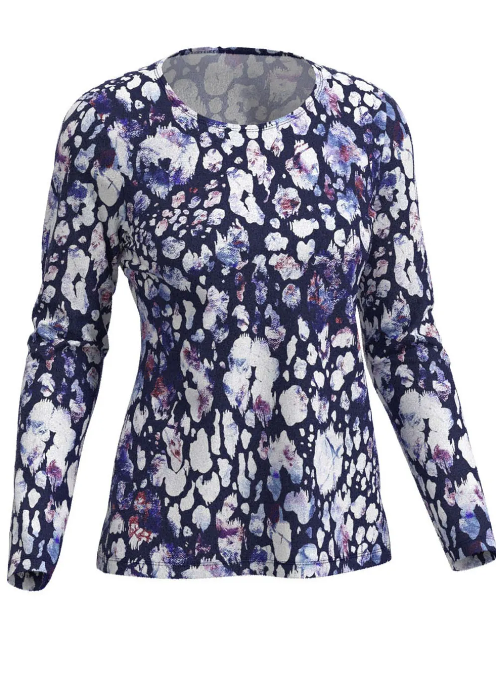Jedes Teil ein Unikat! Pullover mit farbbrillantem Alloverdruck in Marine-Weiß-Multicolor, rundem Halsausschnitt sowie langen Ärmeln.