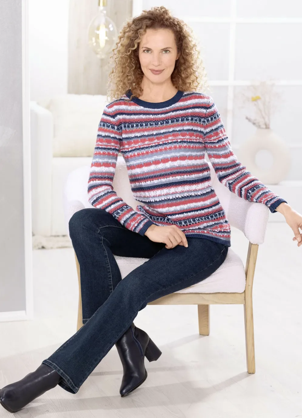 Toller Pullover in Koralle-Marine-Multicolor, mit rundem Halsausschnitt, aufwendigem Struktur- und Garnmix mit Ajourakzenten in Ringeloptik rundum, langen Ärmeln sowie Kontrastabschlüssen.