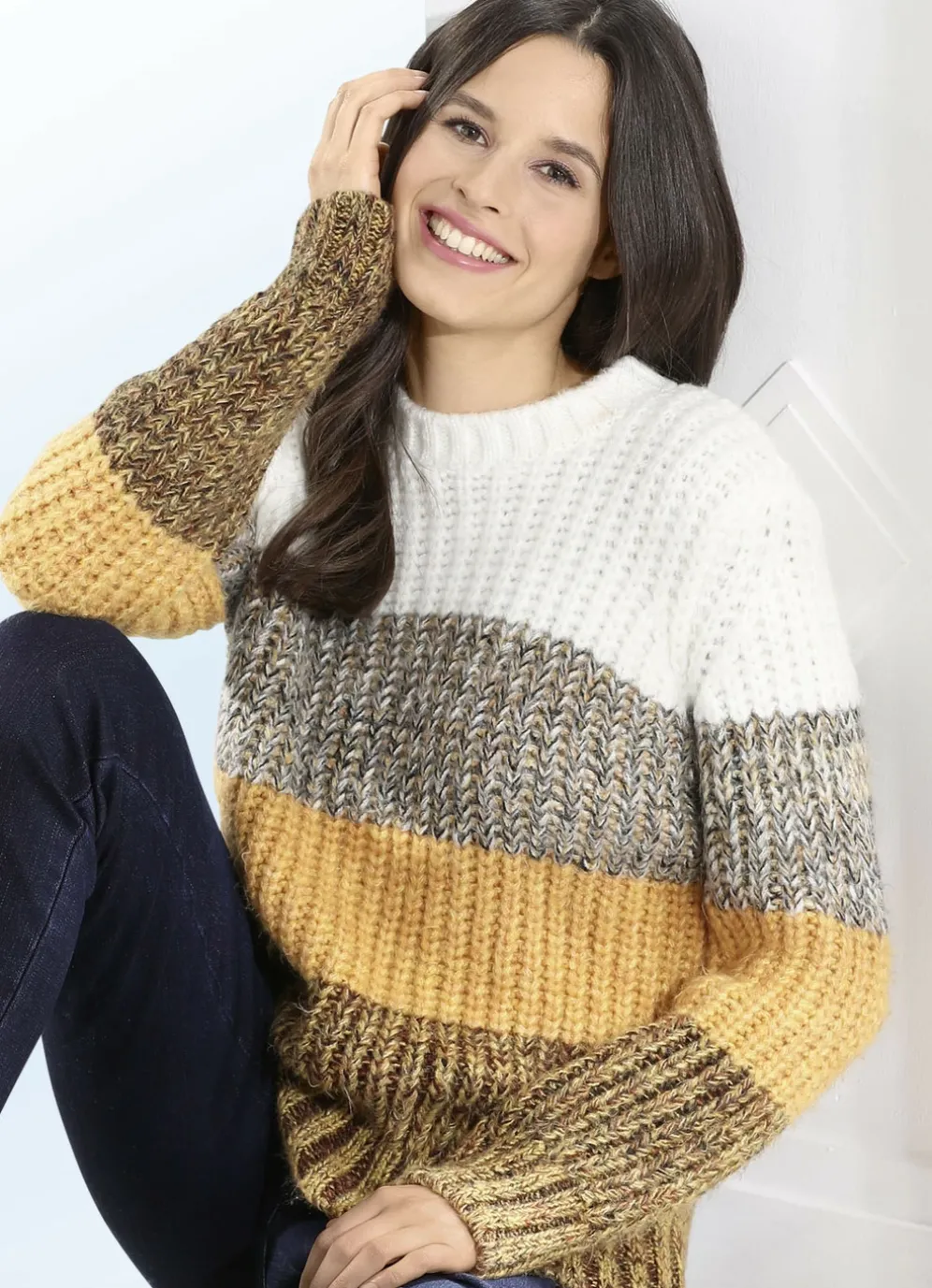 Pullover mit Streifendessin in Curry-Ecru-Multicolor allover, aufwendigen Melange-Effekten sowie Rippenbundabschlüssen am runden Halsausschnitt, an den langen Ärmeln sowie am Saum.